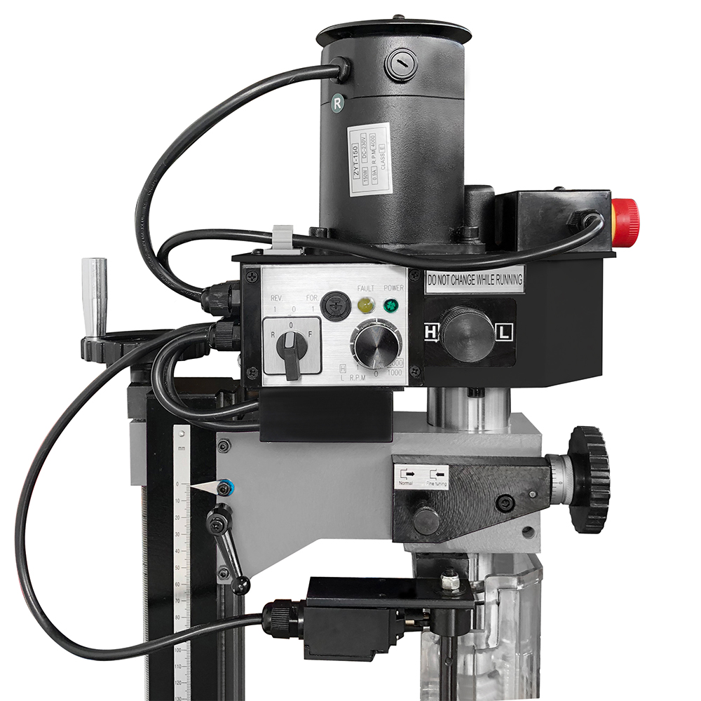 Il mandrino, montato su cuscinetti a sfere di elevata precisione, è azionato da un motore DC monofase da 150 W: questa tipologia di motore garantisce una coppia costante e carichi che non sono alterati dalla velocità. Tramite un semplice selettore collocato su di un lato della testa a fresare, sarà possibile scegliere il verso di rotazione del mandrino (orario/antiorario).