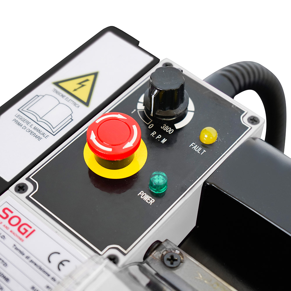 Il tornio SOGI M1-100 vanta un motore in corrente continua monofase da 150 W, con possibilità di settaggio della velocità del mandrino direttamente su pannello di comando. La velocità di rotazione del mandrino, regolabile tramite potenziometro, può raggiungere valori massimi intorno ai 3800 rpm.