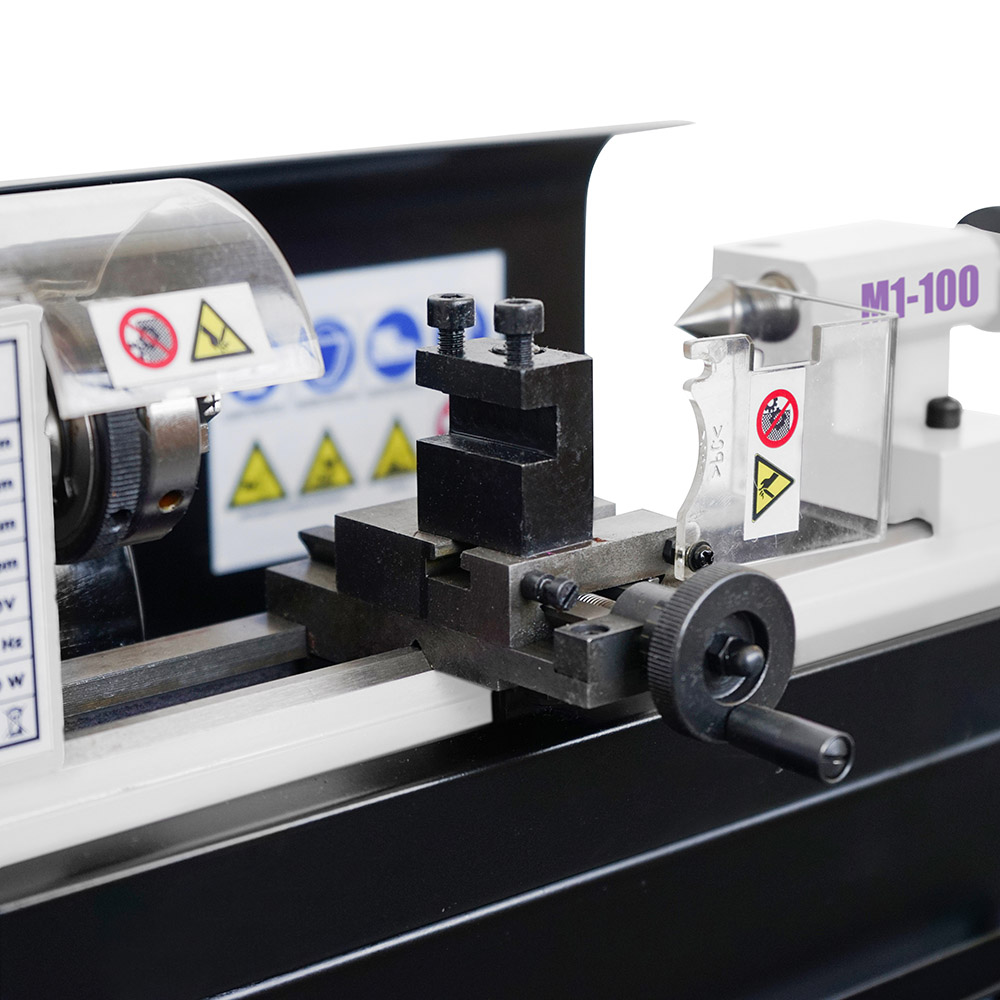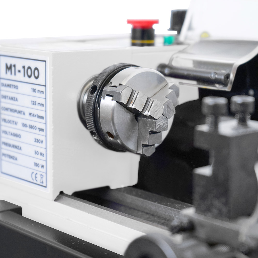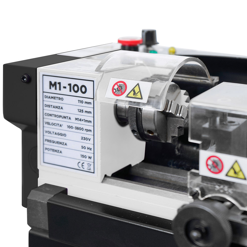 Il tornio da banco 800SGI00854 è a funzionamento totalmente manuale. Per una maggior precisone, su ciascun nonio è incisa una scala graduata. In accordo con la normativa vigente in materia di sicurezza, il tornio M1-100 è corredato di tutti i dispositivi di protezione necessari a preservare la salute dell'operatore e dell'ambiente circostante (schermi protettivi in policarbonato e/o lamiera, interruttore di emergenza).