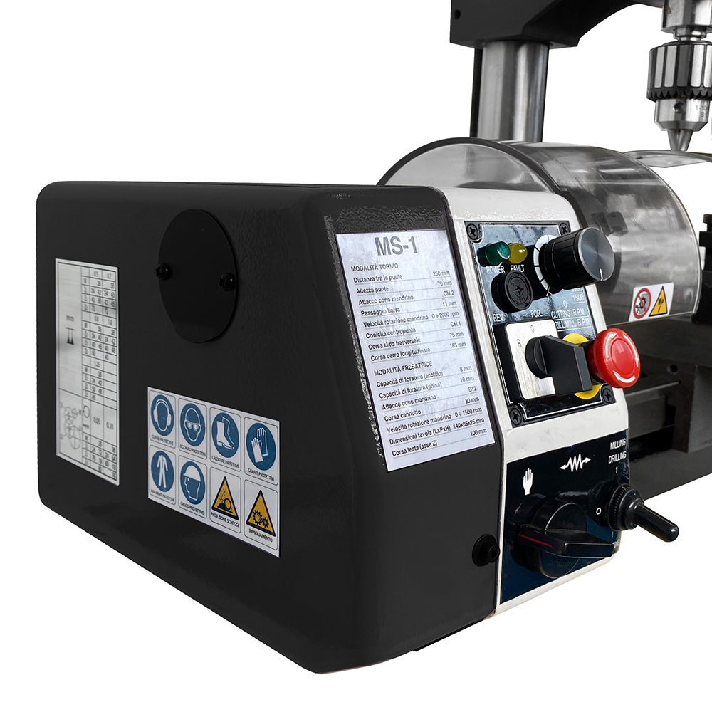 In accordo con la normativa vigente in materia di sicurezza, il tornio-fresa per metalli SOGI MS-1 è corredato di tutti i dispositivi di protezione necessari a preservare la salute dell'operatore e dell'ambiente circostante: schermi protettivi in policarbonato mobili (di cui uno interbloccato) e fissi, interruttore di emergenza.
