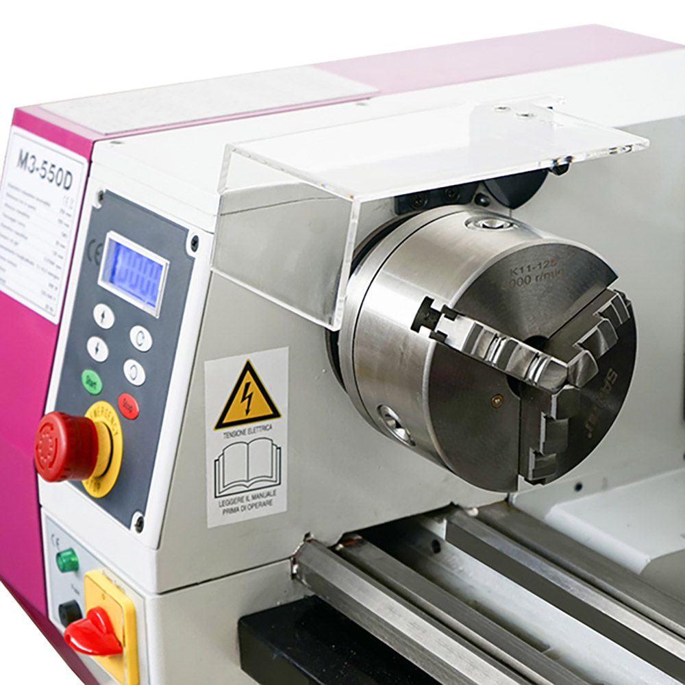 In accordo con la normativa vigente in materia di sicurezza, il tornio M3-550D è corredato di tutti i dispositivi di protezione necessari a preservare la salute dell'operatore e dell'ambiente circostante (schermi protettivi in policarbonato e/o lamiera, interruttore di emergenza).
