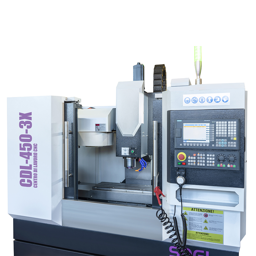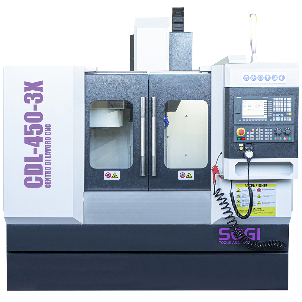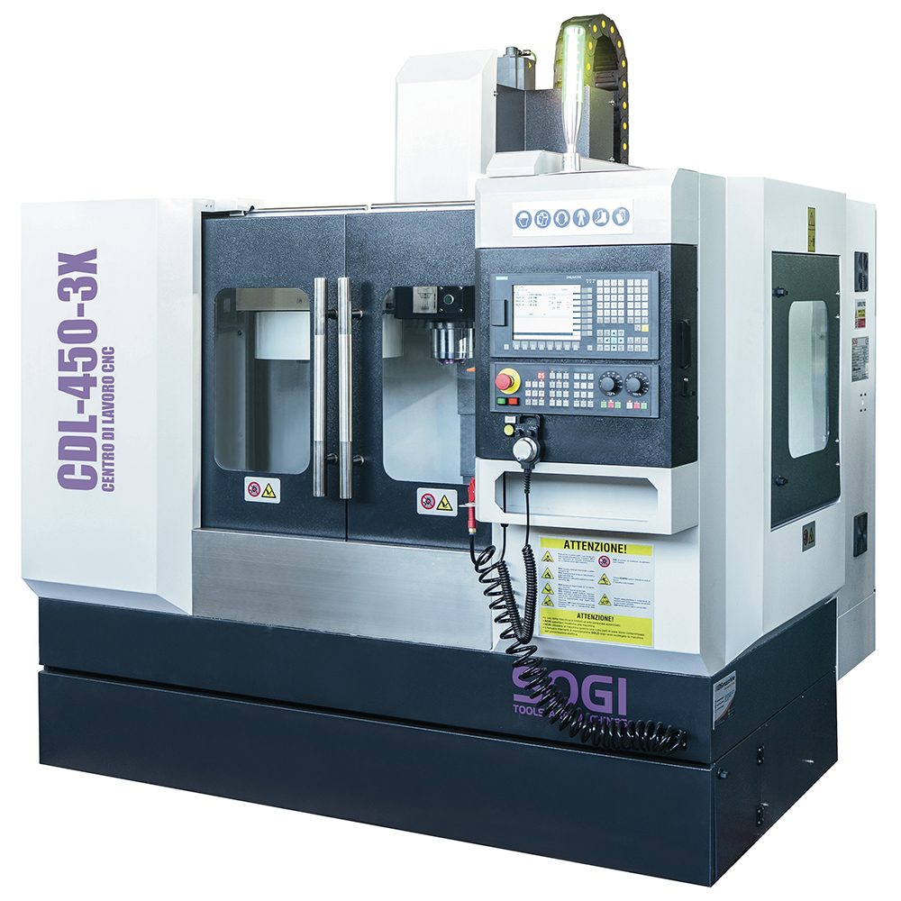 Il centro di lavoro verticale SOGI CDL-450-3X è una macchina a controllo numerico a tre assi in grado di effettuare molteplici lavorazioni su materiali metallici e leghe derivate, materiali polimerici e molto altro. Grazie alla sua versatilità d'utilizzo, la macchina si presta particolarmente bene ad un impiego nel campo industriale e prototipazione per la messa a punto di componenti più o meno complessi garantendo un'elevata precisione nel risultato (giunti, alberi di trasmissione ecc.).