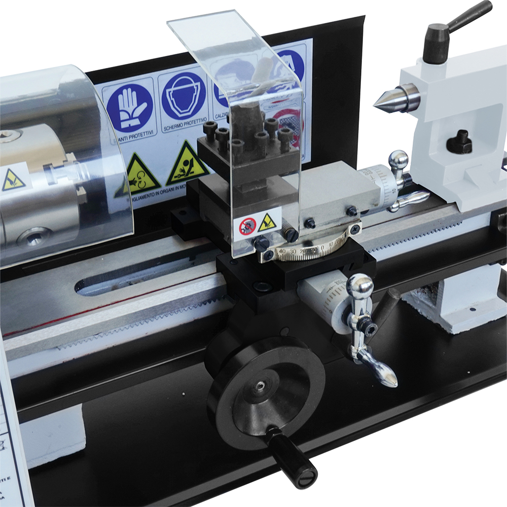 Il tornio da banco 800SGI00303 ha l'avanzamento longitudinale automatico (asse X) per l'esecuzione sistematica della lavorazione: per una maggior precisone, su ciascun nonio è incisa una scala graduata. La torretta portautensili è inclinabile di ± 45° per l'esecuzione di torniture coniche e/o smussi. Servendosi del set di ingranaggi in dotazione e grazie alla presenza di una leva posteriore, è possibile realizzare una vasta gamma di filettature Metriche.