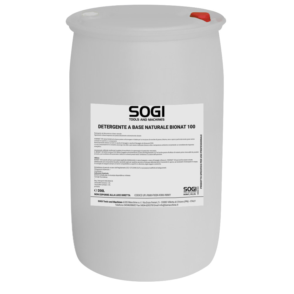 Detergente sgrassante SOGI BIONAT 100 - sostenibile, naturale e potente - per uso manuale o in vasche - fusto da 200 L