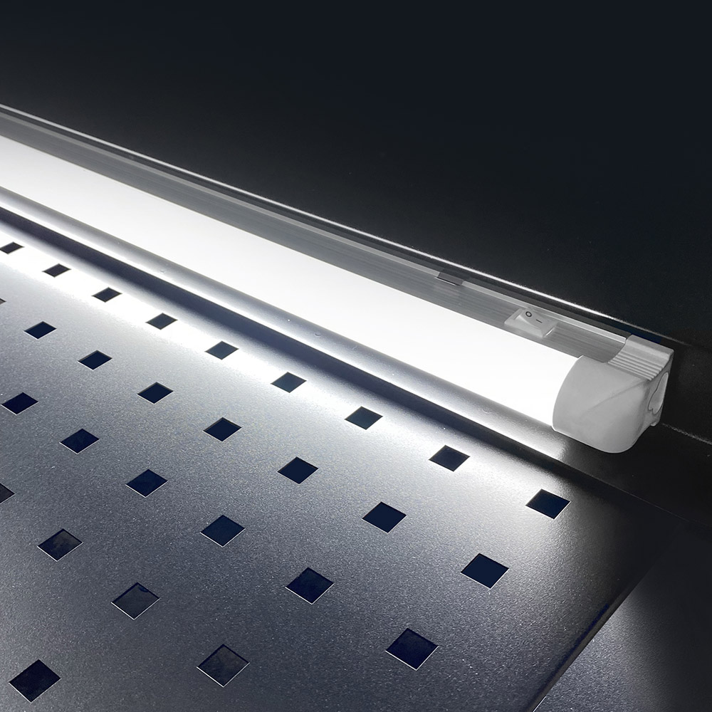 Al disotto del singolo pensile è installata una lampada tubolare fluorescente per un'illuminazione ottimale del piano di lavoro.