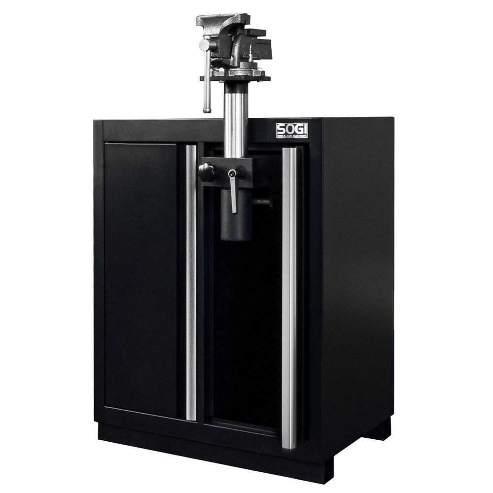 Realizzato in lamiera di acciaio verniciata a polveri, l'armadio basso a due ante SOGI ARR-MOD-MORSA racchiude al suo interno, nel vano destro, una morsa con braccio estraibile e porta a scomparsa. La morsa, realizzata in ghisa e acciaio, ha un'apertura di 105 mm e le ganasce larghe 125 mm: il supporto è regolabile in altezza per agevolare l'operatore nella lavorazione.