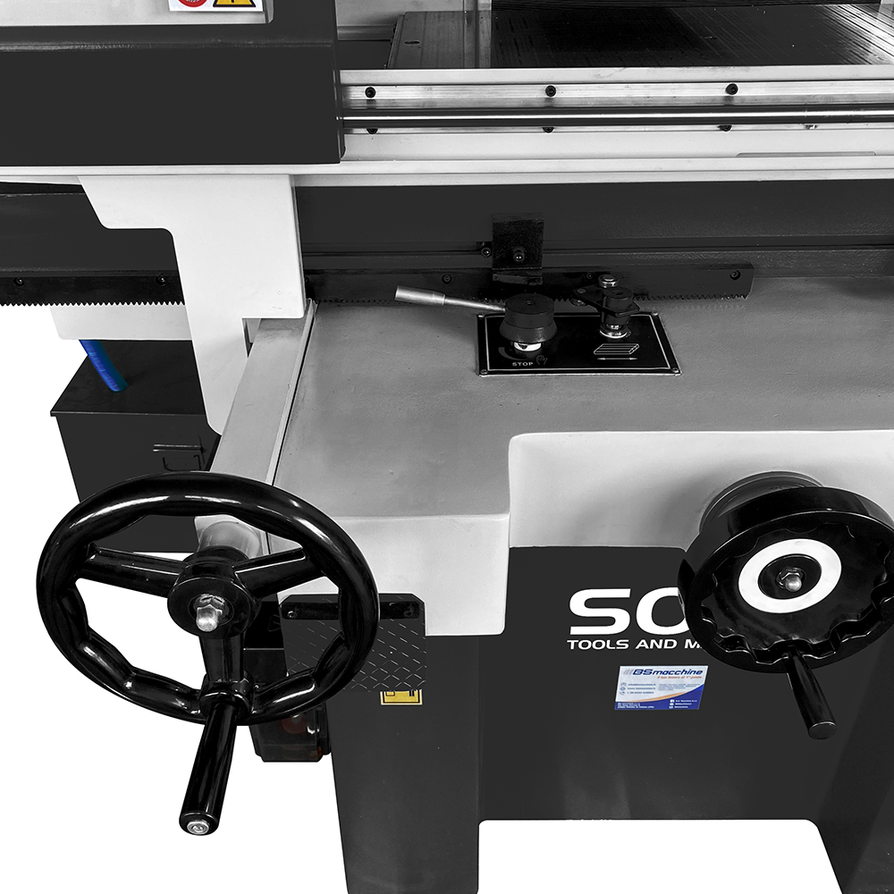 La tavola scorre in direzione longitudinale lungo due guide, una a "V"ed una lineare, lubrificate da una centralina automatica comandata da PLC. I moti verticale della testa portamola e trasversale della tavola sono a controllo automatico (oltre che manuale) possibile grazie a motori solidi (e volantini ergonomici). L'intensità della forza magnetica ed il tempo di smagnetizzazione possono essere regolati comodamente dal pannello di comando principale a mezzo manopole.