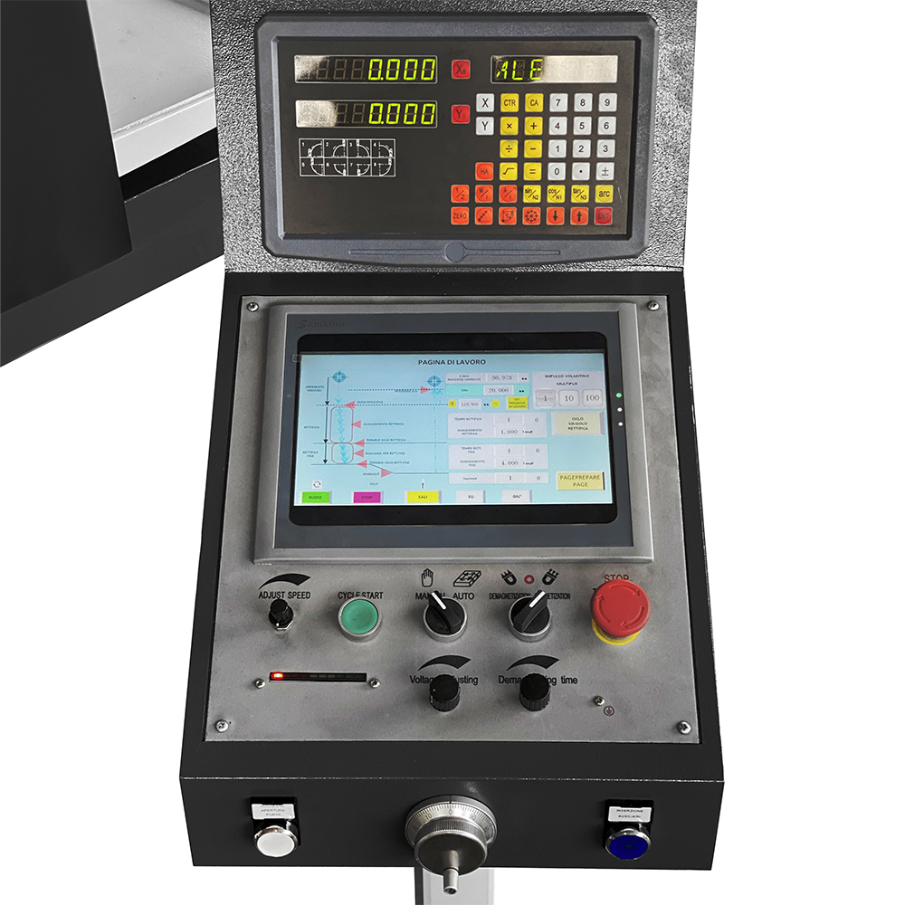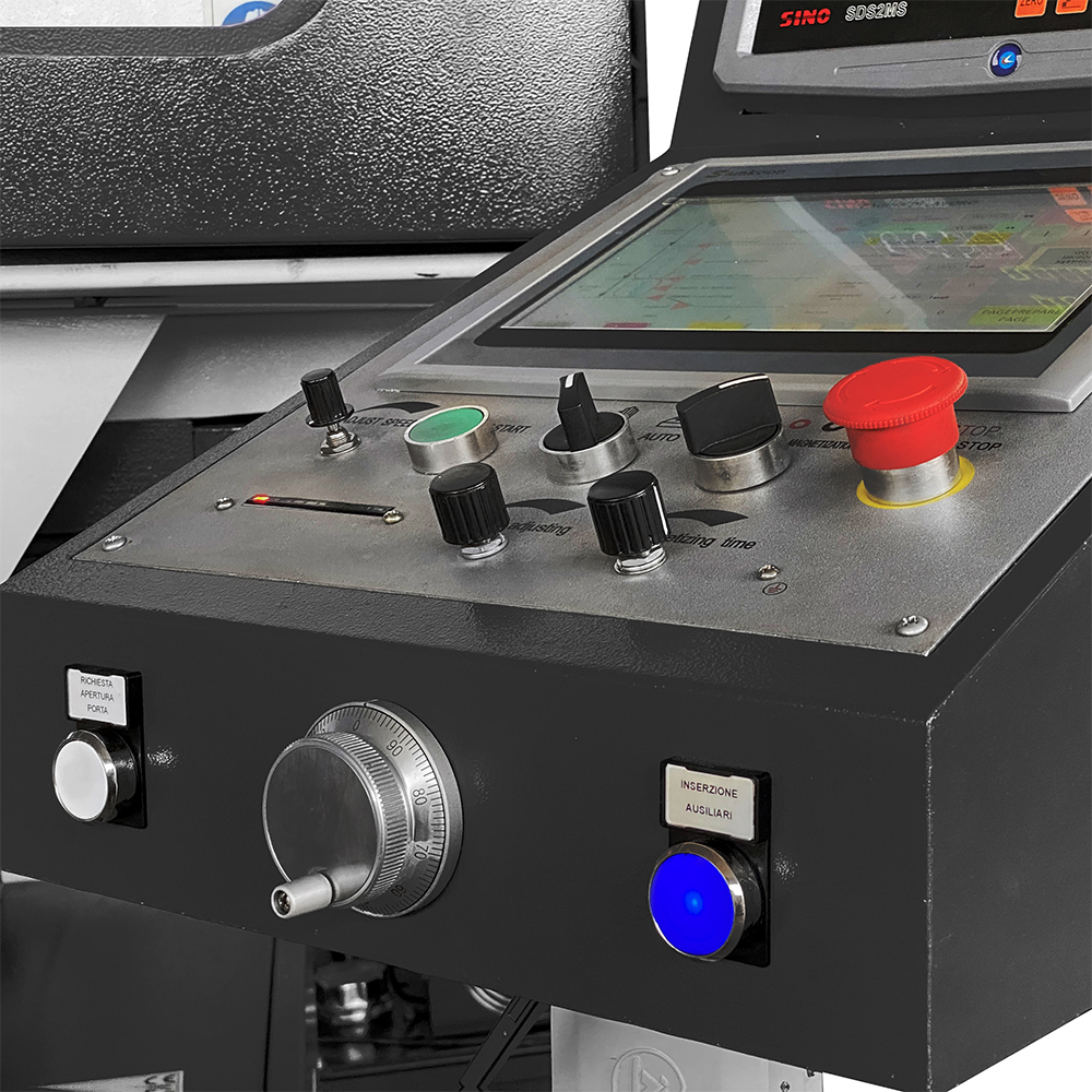 Tra le tante peculiarità che rendono questa macchina all'avanguardia, particolare importanza riveste il PLC FATEK di fattura taiwanese serie B1 che comunica con l'interfaccia uomo-macchina SAMKOON SA. Grazie alla combinazione di hardware e software, è possibile programmare il numero di passate in sgrossatura e finitura, controllare l'avanzamento mola ed il ciclo di spark-out, nonché la posizione di ritorno a fine ciclo. Un visualizzatore di quote sugli assi verticale e trasversale consente un posizionamento preciso.