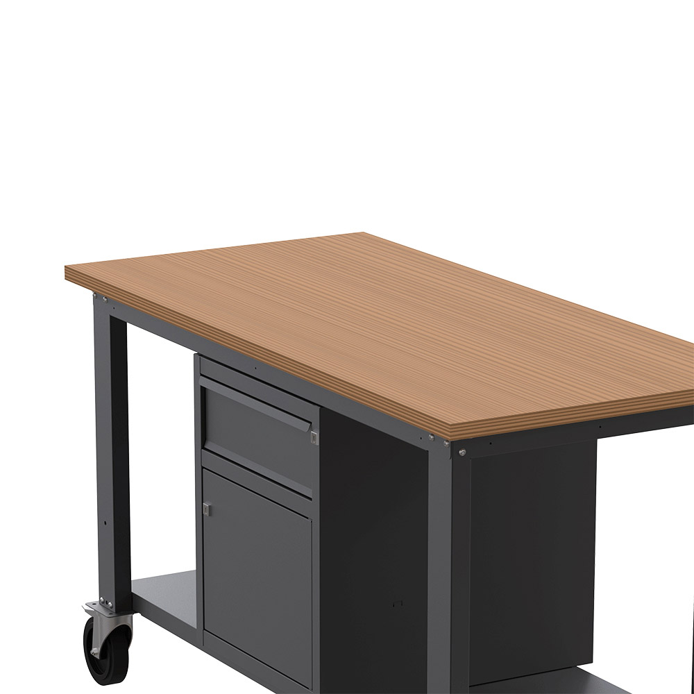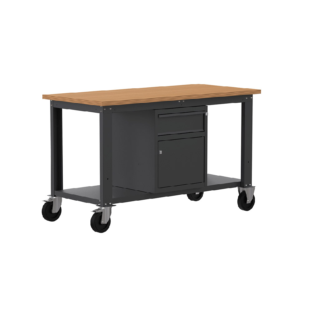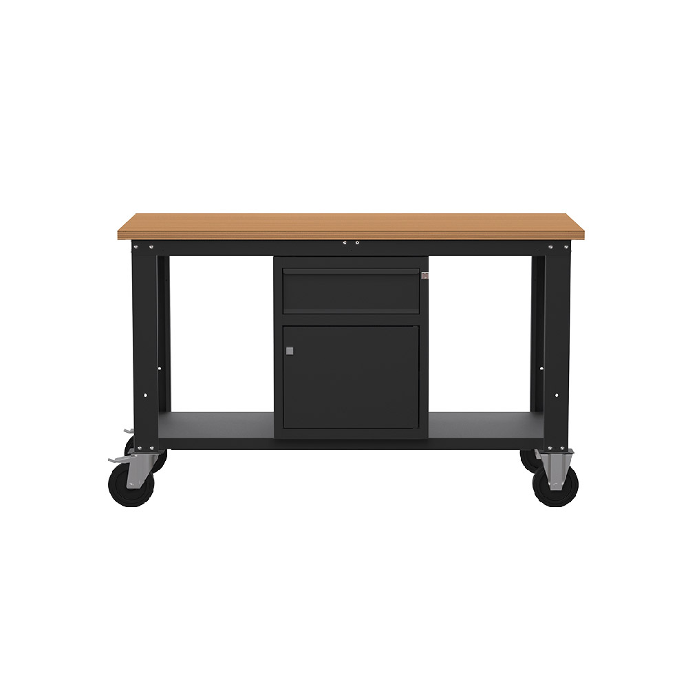 Banco da lavoro con ruote SOGI X3N_103LR - 1.5 m - piano in legno - armadio con anta e cassetto