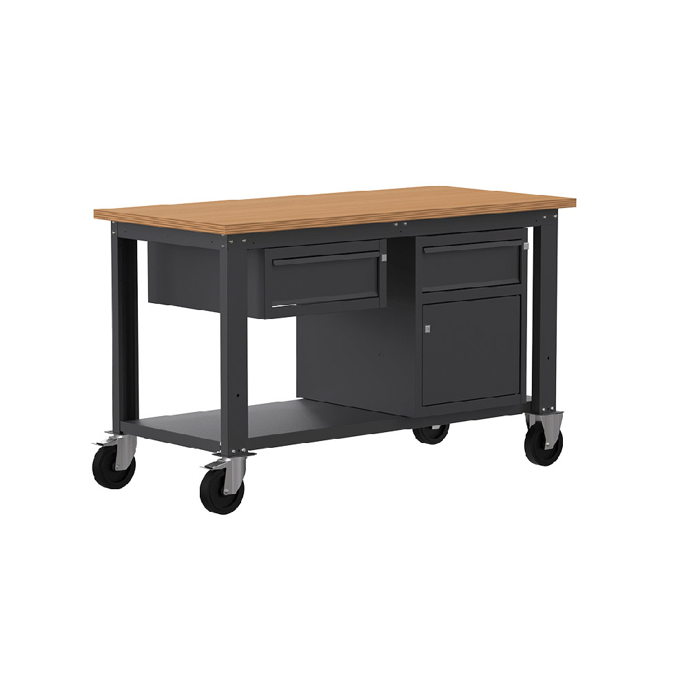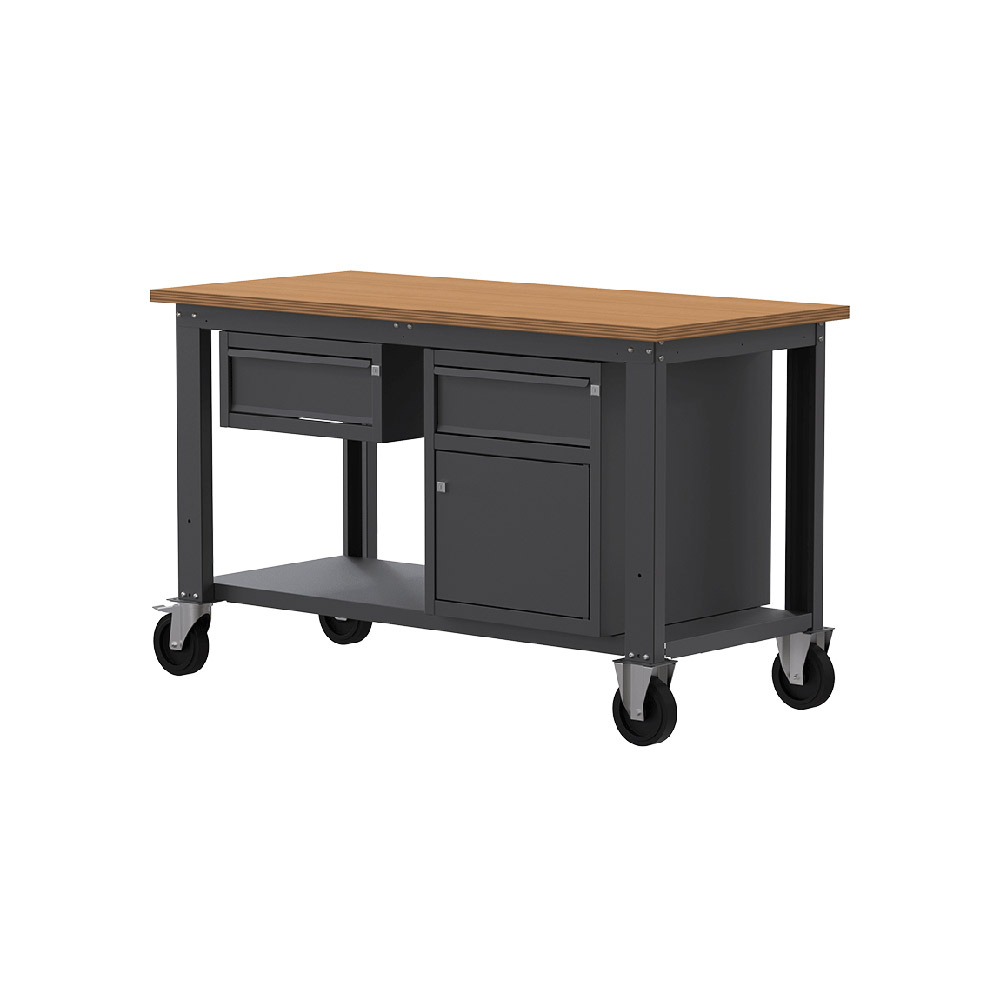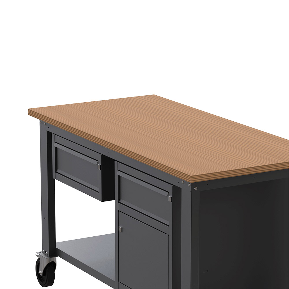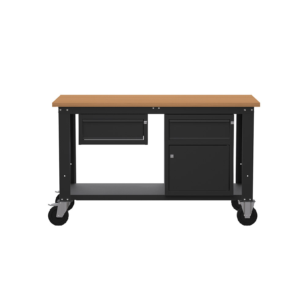 Banco lavoro con ruote SOGI X3N_107LR - 1.5 m - piano in legno - 1 cassetto + anta e cassetto
