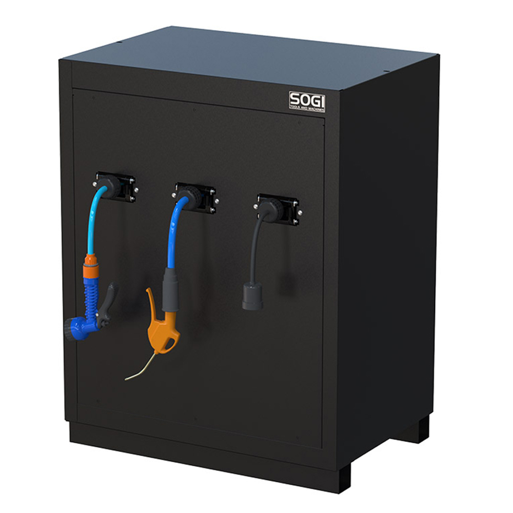 Realizzato in lamiera di acciaio verniciata a polveri, l'armadietto basso SOGI ARR-M-AEA vanta al suo interno ben due avvolgitubo, uno per l'acqua, l'altro per l'aria compressa, ed un avvolgicavo elettrico, così da avere a portata di mano tutto l'occorrente per la lavorazione senza rinunciare al comfort ed alla sicurezza.