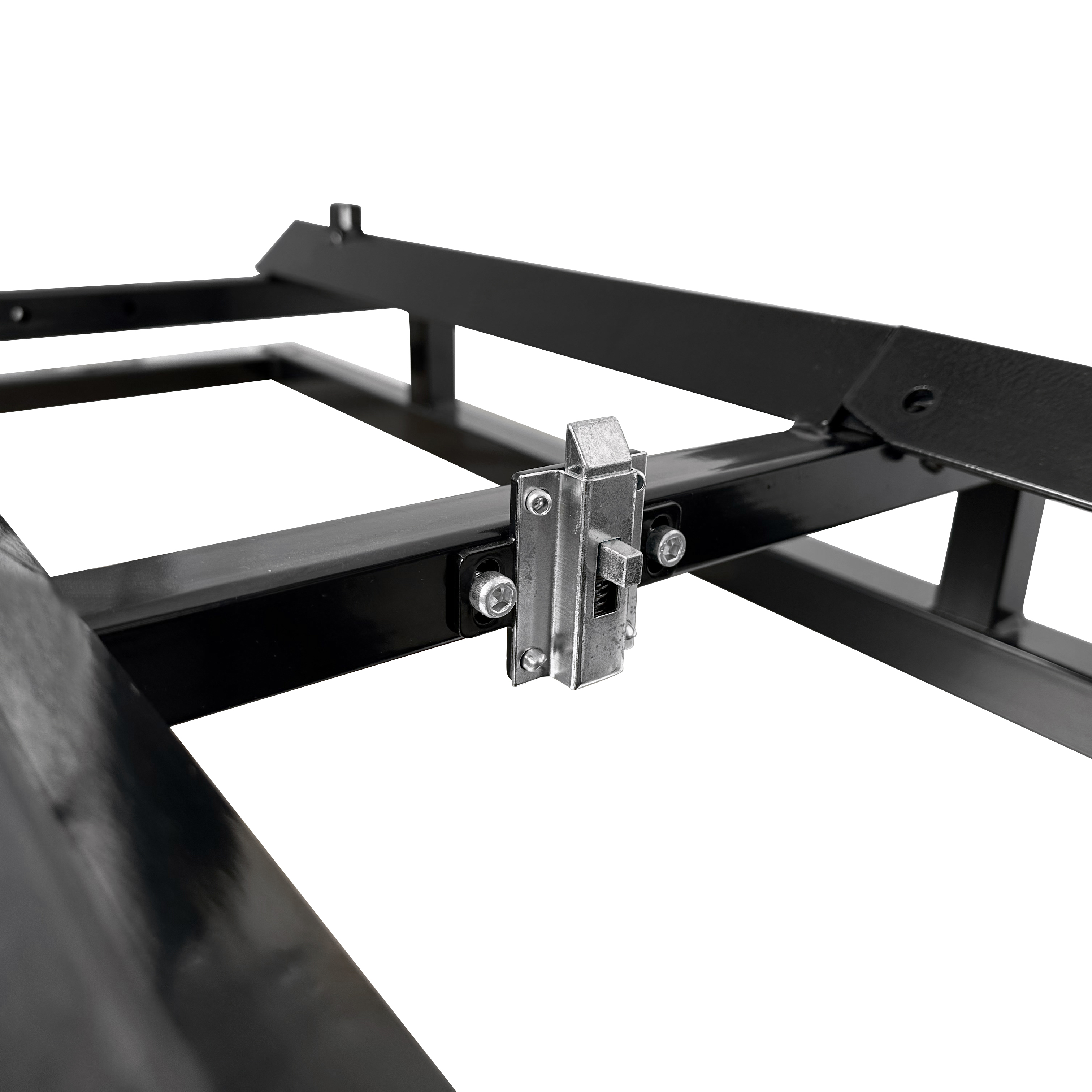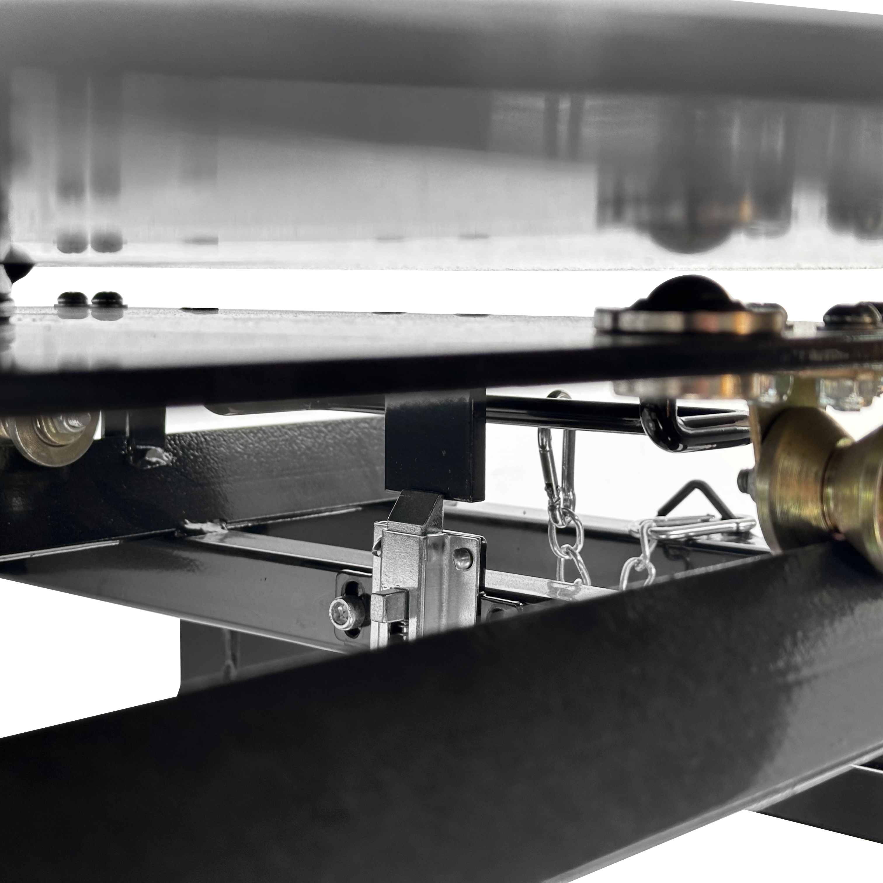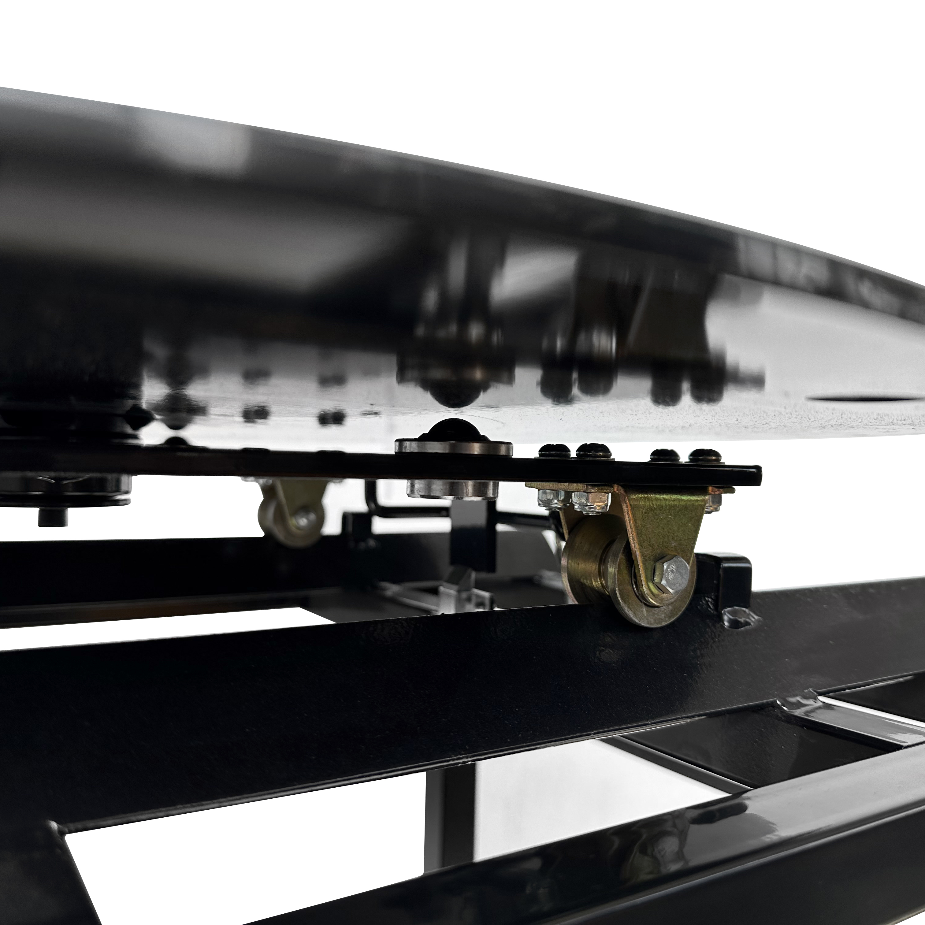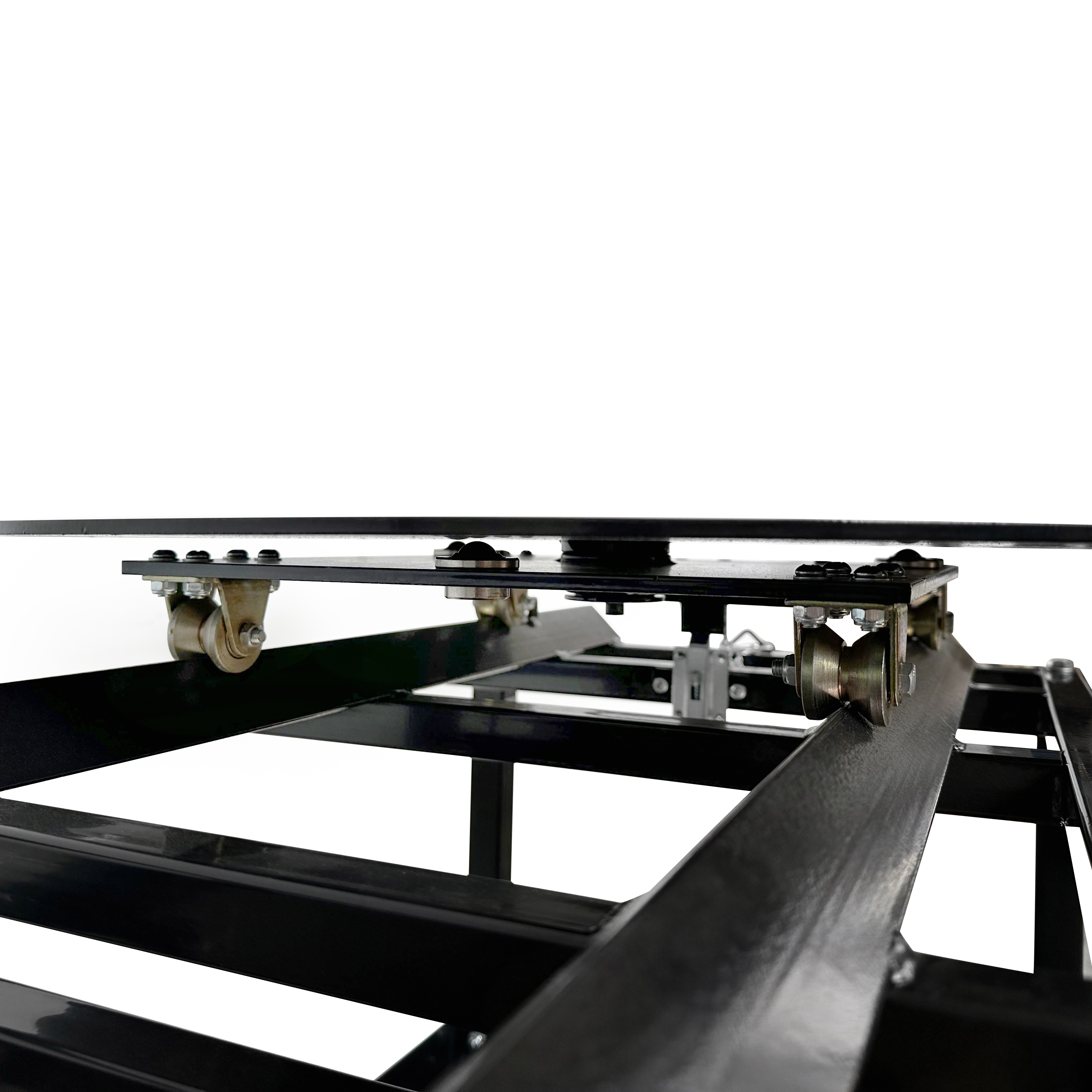 La tavola girevole può essere estratta completamente dai binari di scorrimento a seconda delle esigenze lavorative: la presenza di un fermo a scatto e di una catenella in acciaio assicurano la tavola al carrello per consentirne il trasporto in totale sicurezza. Il telaio poggia su 4 ruote pivotanti, 2 delle quali dotate di freno.