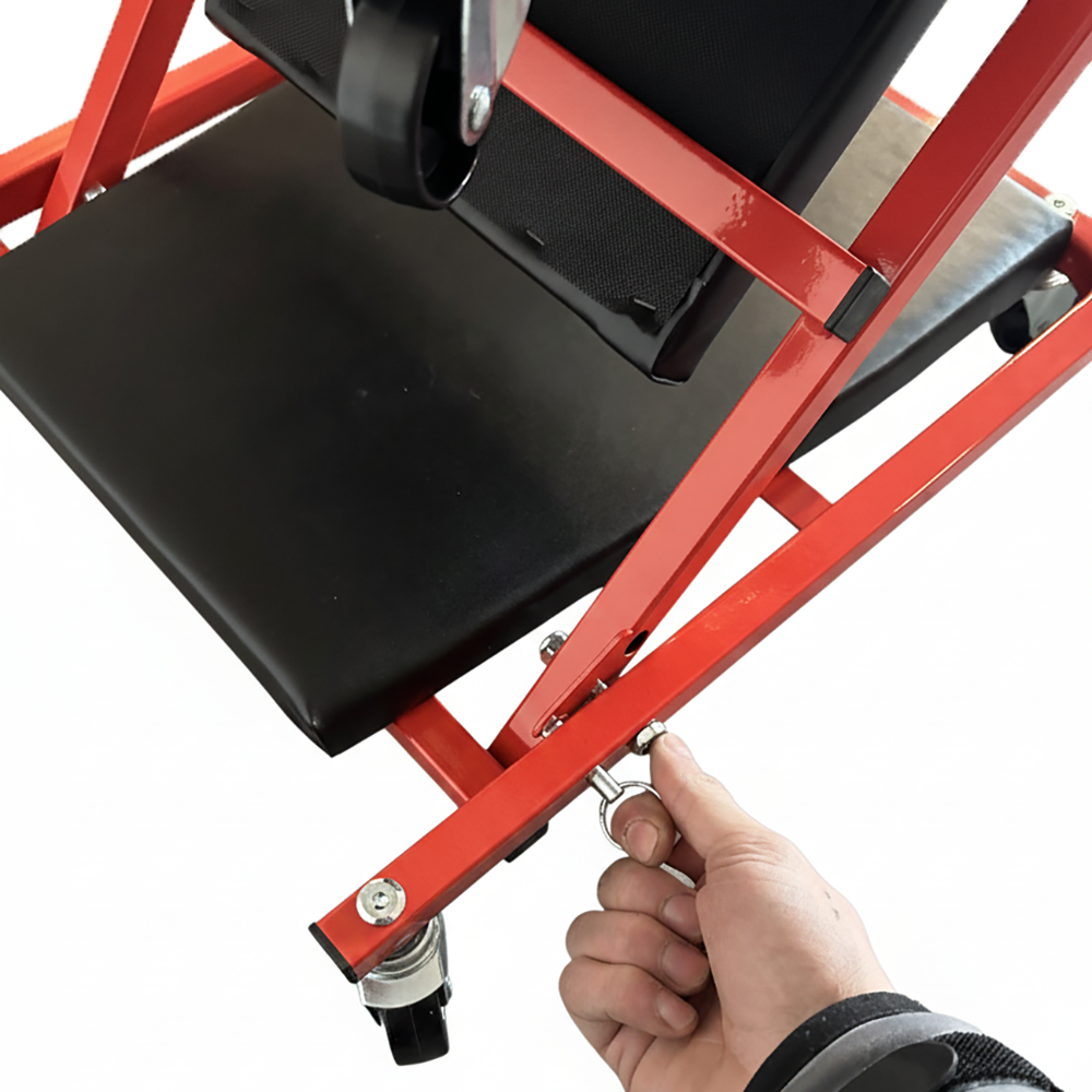 • Design pieghevole 2-in-1: cambia rapidamente configurazione da carrello sotto auto a sgabello, ottimizzando spazio e funzionalità, grazie al pratico perno a molla con anello.