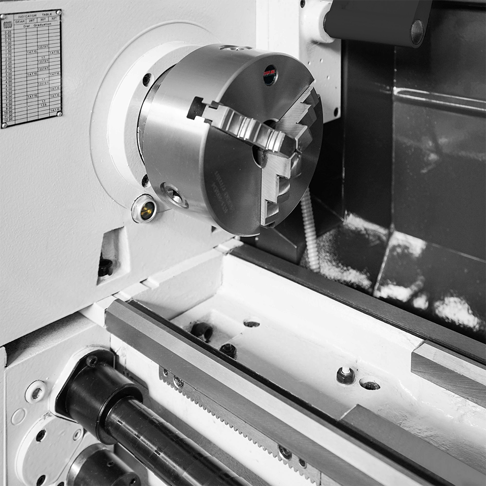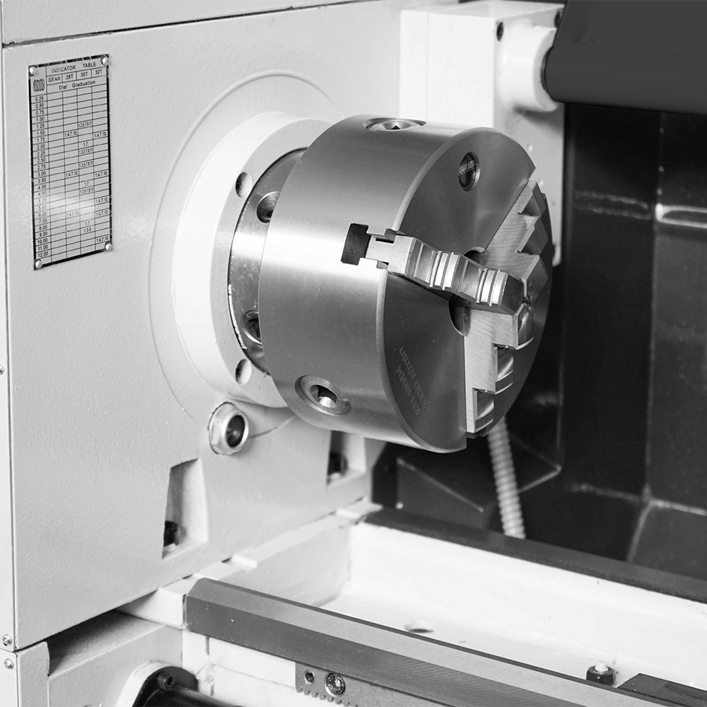 Il mandrino, autocentrante 3+3 griffe, ha un diametro di Ø 160 mm ed ha un attacco Camlock che assicura un corretto e pratico centraggio rispetto all'asse mandrino. Quest'ultimo è montato su cuscinetti a rulli conici regolabili di alta qualità per assicurare un incremento delle prestazioni a fronte di una riduzione dell'attrito in gioco. Il mandrino è azionato da un motore asincrono monofase da ben 1500 W: per arrestare immediatamente la sua rotazione, è sufficiente azionare il freno meccanico per mezzo di opportuno pedale.