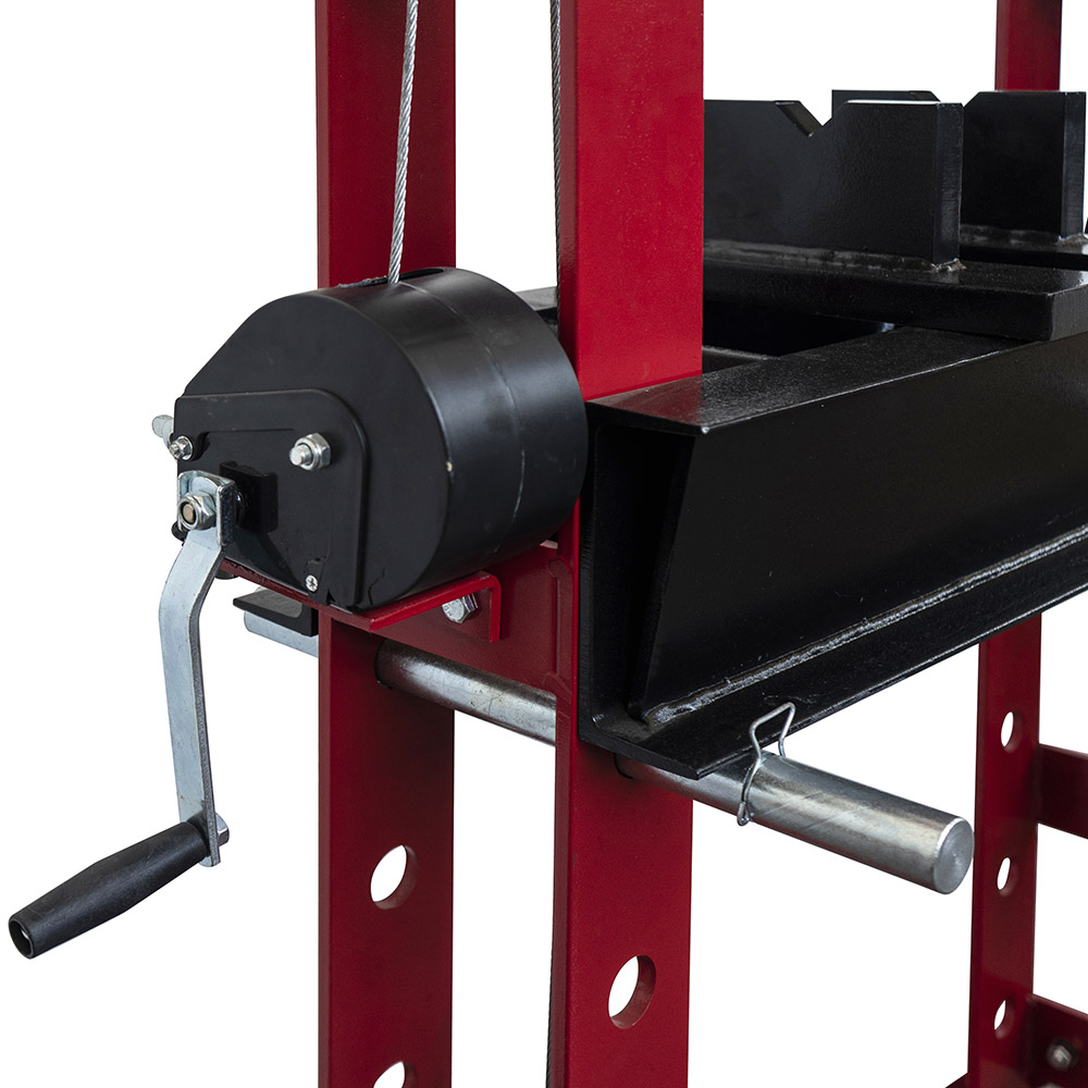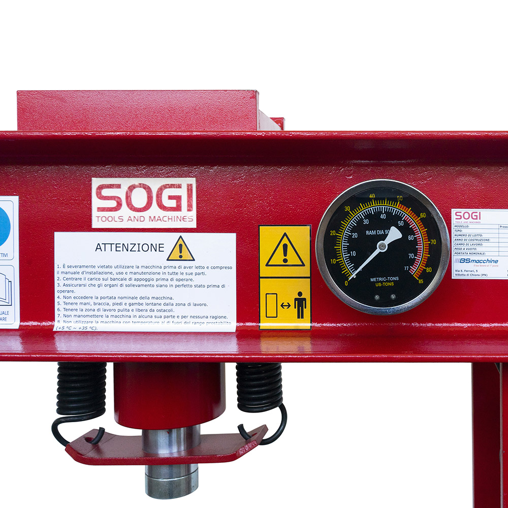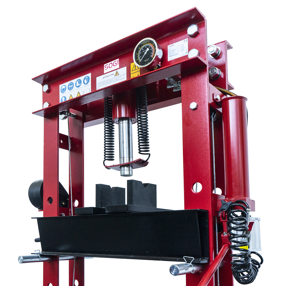 La pressa SOGI P50-MP è ideale per l'estrazione di cuscinetti da autoveicoli e motoveicoli: facile da utilizzare, è in grado di coprire un'ampia gamma di lavorazioni meccaniche, grazie al piano di lavoro regolabile su 7 livelli differenti di altezza ed il sistema di sollevamento a verricello. Il manometro è integrato nella struttura e può sopportare forze di pressatura fino a 50 tonnellate.
