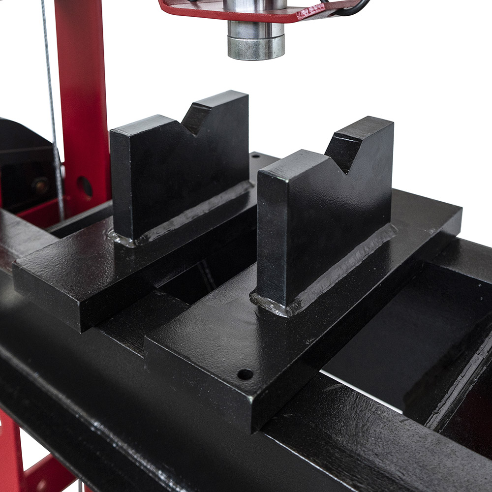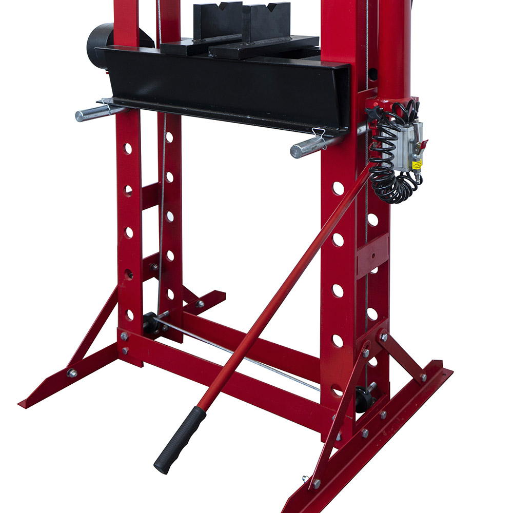 Il telaio saldato è realizzato in acciaio ed è verniciato a polvere nella colorazione nera o rossa (a seconda della disponibilità). La macchina è provvista di una pompa ad azionamento manuale o pneumatico: quando le esigenze lavorative richiedono pressature calibrate e precise, è sufficiente inserire una leva nell'apposito alloggiamento per l'esecuzione manuale della lavorazione. Altrimenti, ricorrendo ad una sorgente esterna per l'aria compressa (NON in dotazione), è possibile azionare la pompa idraulica per ottenere una discesa rapida del pistone.