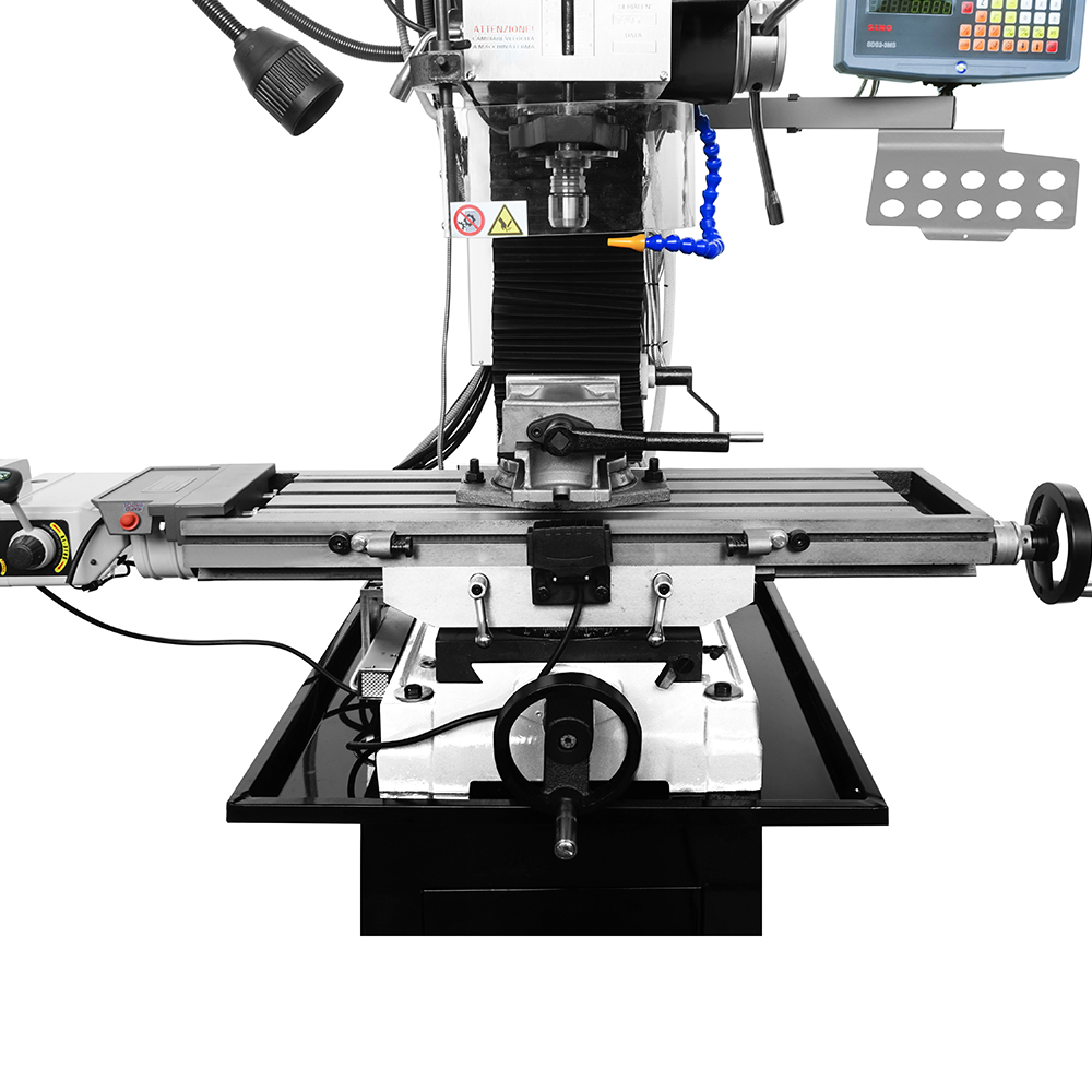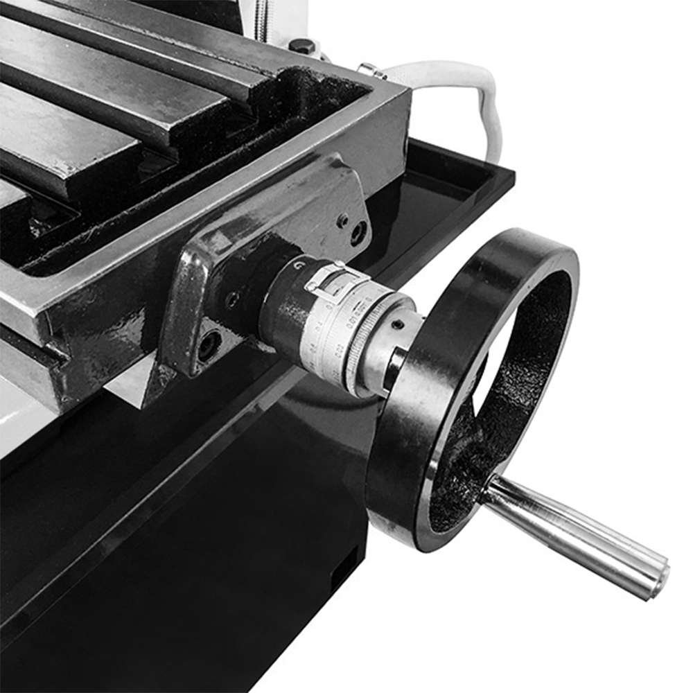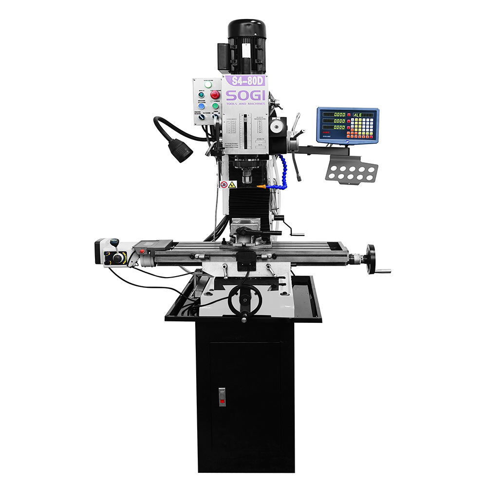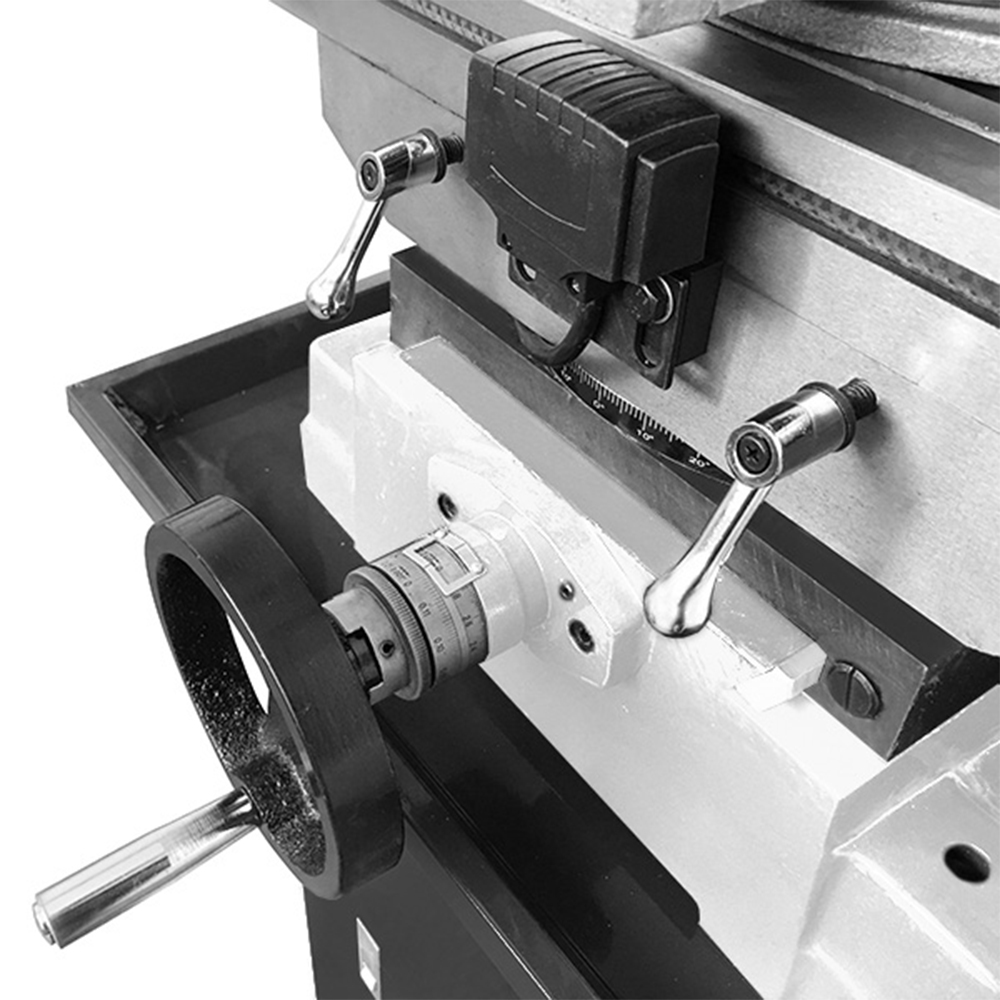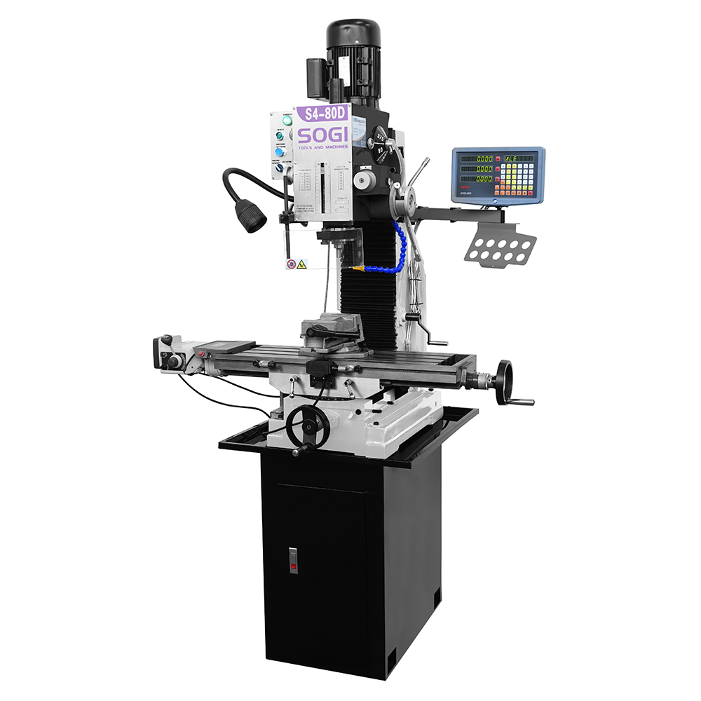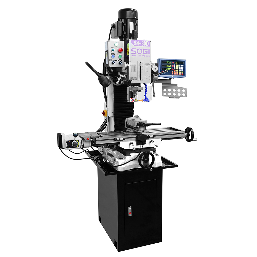 Il trapano-fresatrice professionale SOGI S4-80D è provvisto di volantini con noni graduati per gli spostamenti longitudinali e trasversali della tavola portapezzo e per la discesa/salita del cannotto. Il moto longitudinale della tavola, oltre che manuale, è automatico per mezzo di apposito motoriduttore. La tavola può, in base alla lavorazione, essere ruotata di ± 45° nel piano orizzontale, con lettura dell’angolo su apposita scala graduata.