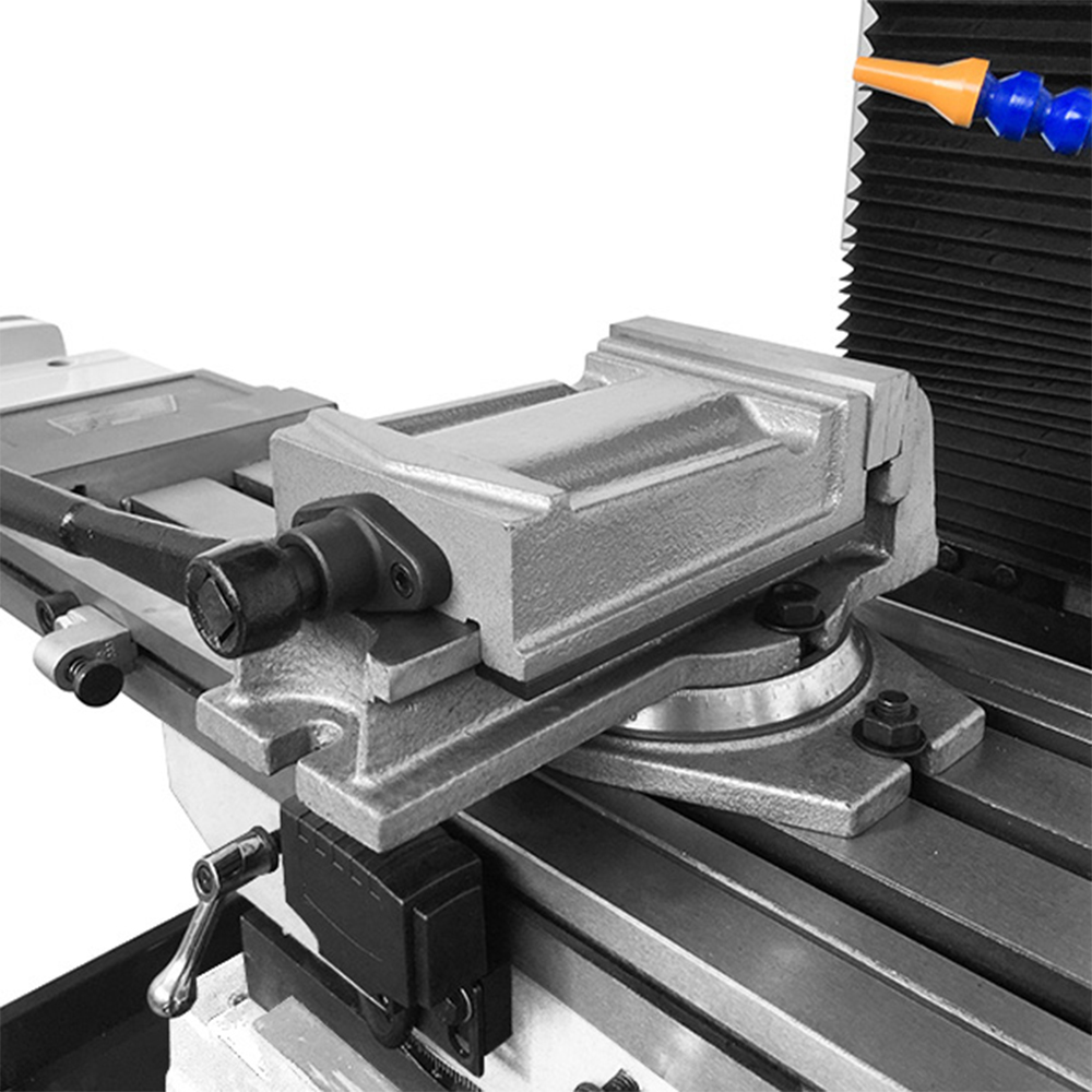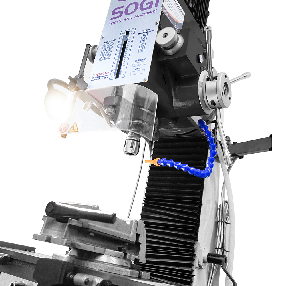 La fresa meccanica SOGI S4-80D è realizzata nel rispetto degli standard vigenti in materia di sicurezza: il mandrino, infatti, è protetto da uno schermo in policarbonato trasparente, la cui apertura è controllata da finecorsa di sicurezza. Il serraggio del mandrino per fresare è possibile grazie ad apposito tirante protetto superiormente da un coperchio ancorato al carter della testa a fresare. Nell’equipaggiamento di serie sono inclusi una lampada, una morsa girevole e l’impianto di lubrorefrigerazione. La macchina​, inoltre,​ è fornita completa di basamento di appoggio in lamiera con vano contenitore.