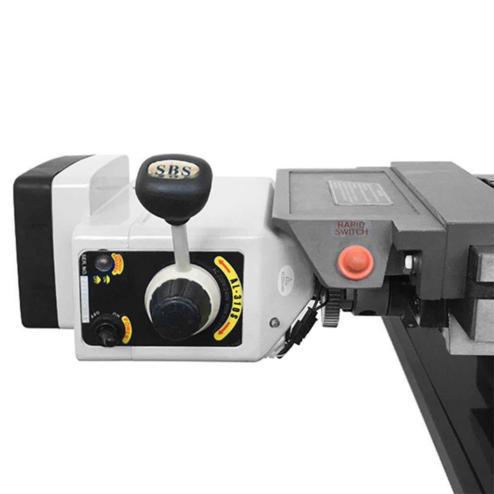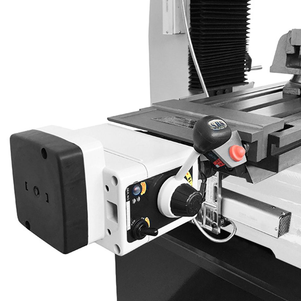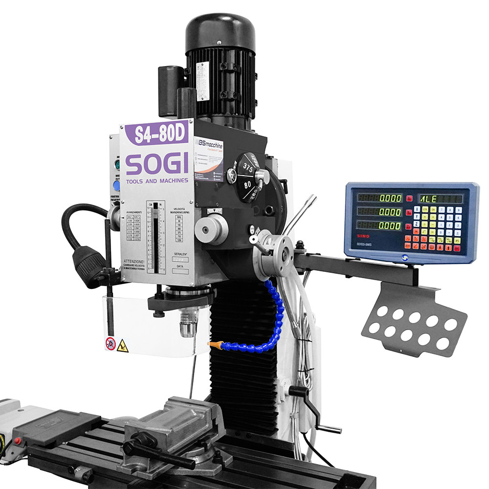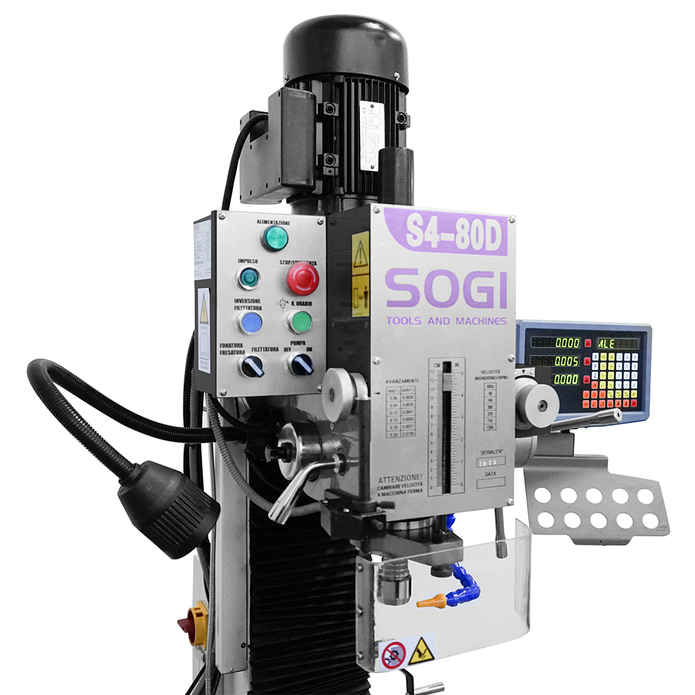 Una delle peculiarità della macchina consiste nella possibilità di invertire la rotazione del mandrino durante le operazioni di maschiatura grazie a due interruttori di finecorsa che delimitano la corsa del cannotto regolabili tra loro. Un’altra caratteristica del trapano-fresa SOGI S4-80D risiede nella presenza di un visualizzatore di quote a tre assi (X, Y, Z), con una precisione di 5 µm e grazie al quale ogni tipo di lavorazione è resa più precisa e veloce.