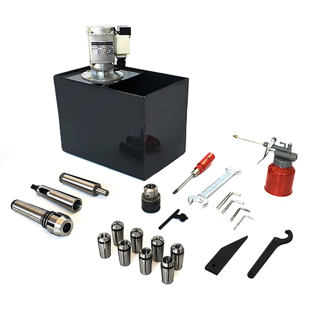 Il mandrino, montato su cuscinetti conici di eccellente fattura, è azionato da un motore ad induzione monofase da 1500 W con condensatore di avviamento: il primo pregio di questo motore è l’elevata coppia di avviamento, a cui si aggiunge un’alta capacità di sovraccarico. Il mandrino può girare a ben 6 diverse velocità di rotazione che possono essere settate semplicemente per mezzo di apposito comando.