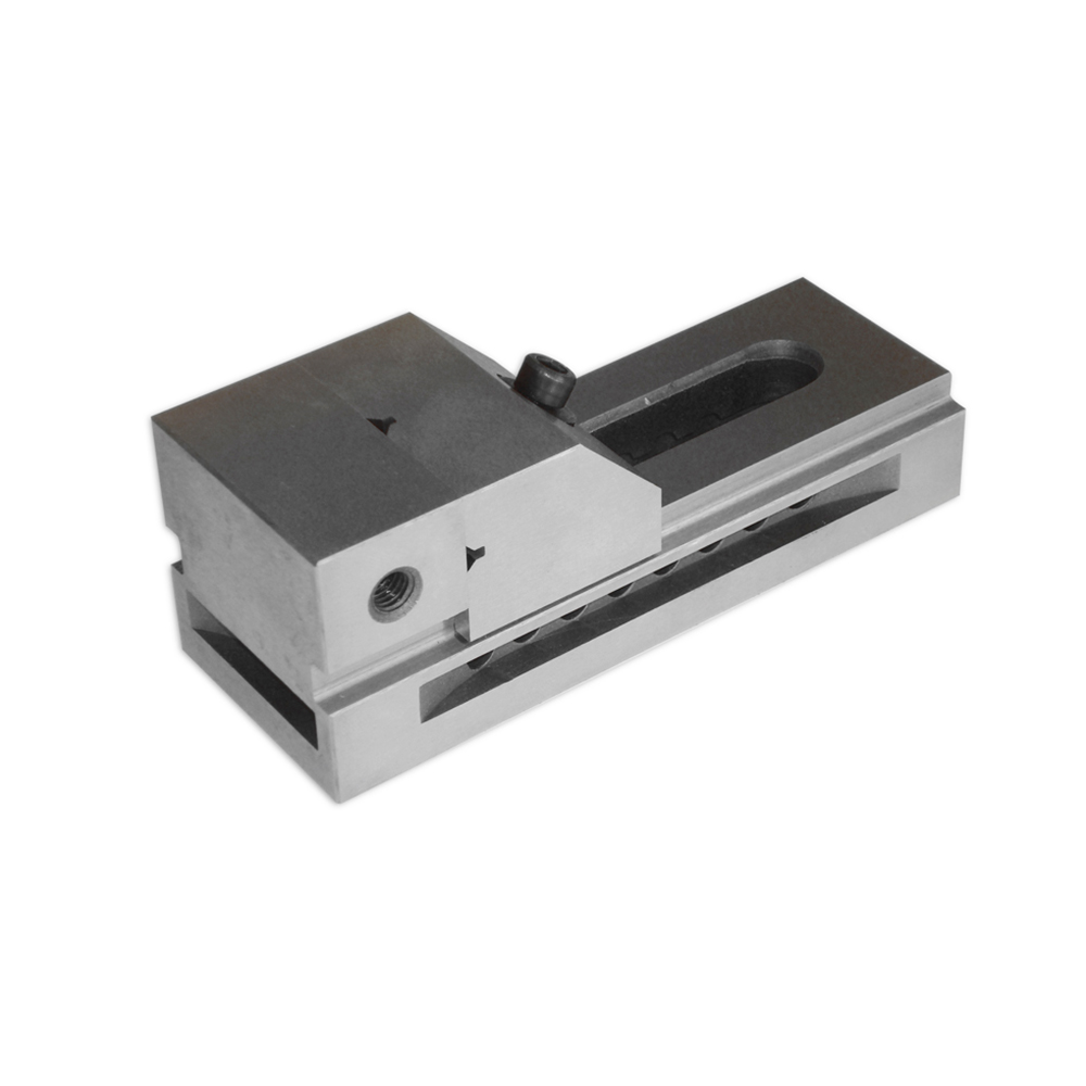 La morsa di precisione SOGI MP-150 è realizzata in acciaio temprato e rettificato ad alta precisione, con serraggio rapido, scanalature per il fissaggio e ganasce con doppio dente di bloccaggio per una presa sicura del pezzo.