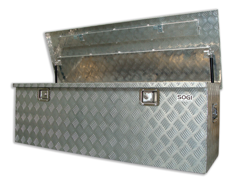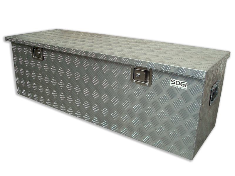 Il baule portautensili SOGI BLE-148 è realizzato in alluminio mandorlato resistente ad urti ed agenti chimici. Il baule e dotato di doppia presa laterale per il trasporto a due persone, doppia serrattura di sicurezza con chiave in duplice copia, doppi ammortizzatori pneumatici per mantere l'apertura del coperchio.