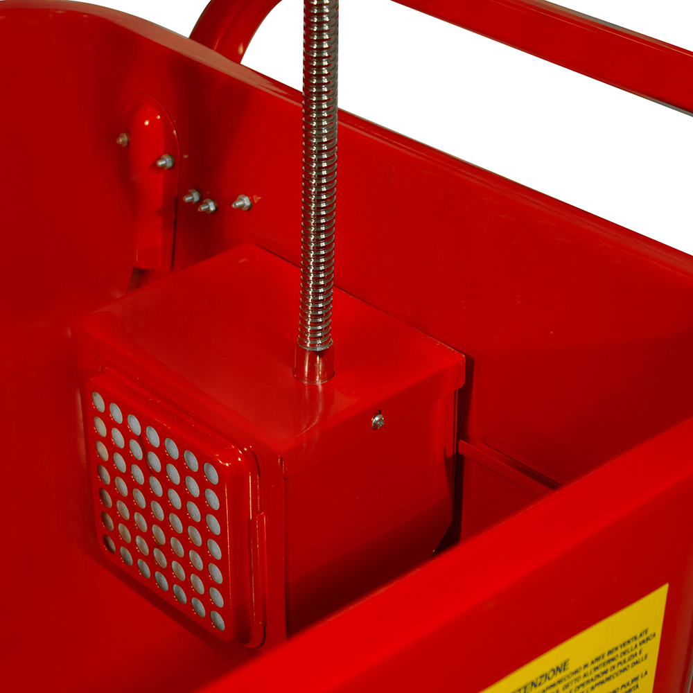 Macchina realizzata in acciaio e verniciata a polvere epossidica per resistere a lungo nel tempo, dotata di ruote per un pratico spostamento all'interno dell'autofficina, laboratorio. È importante non usare gasolio, benzina e altri tipi di solventi all'interno della vasca per il lavaggio dei pezzi.