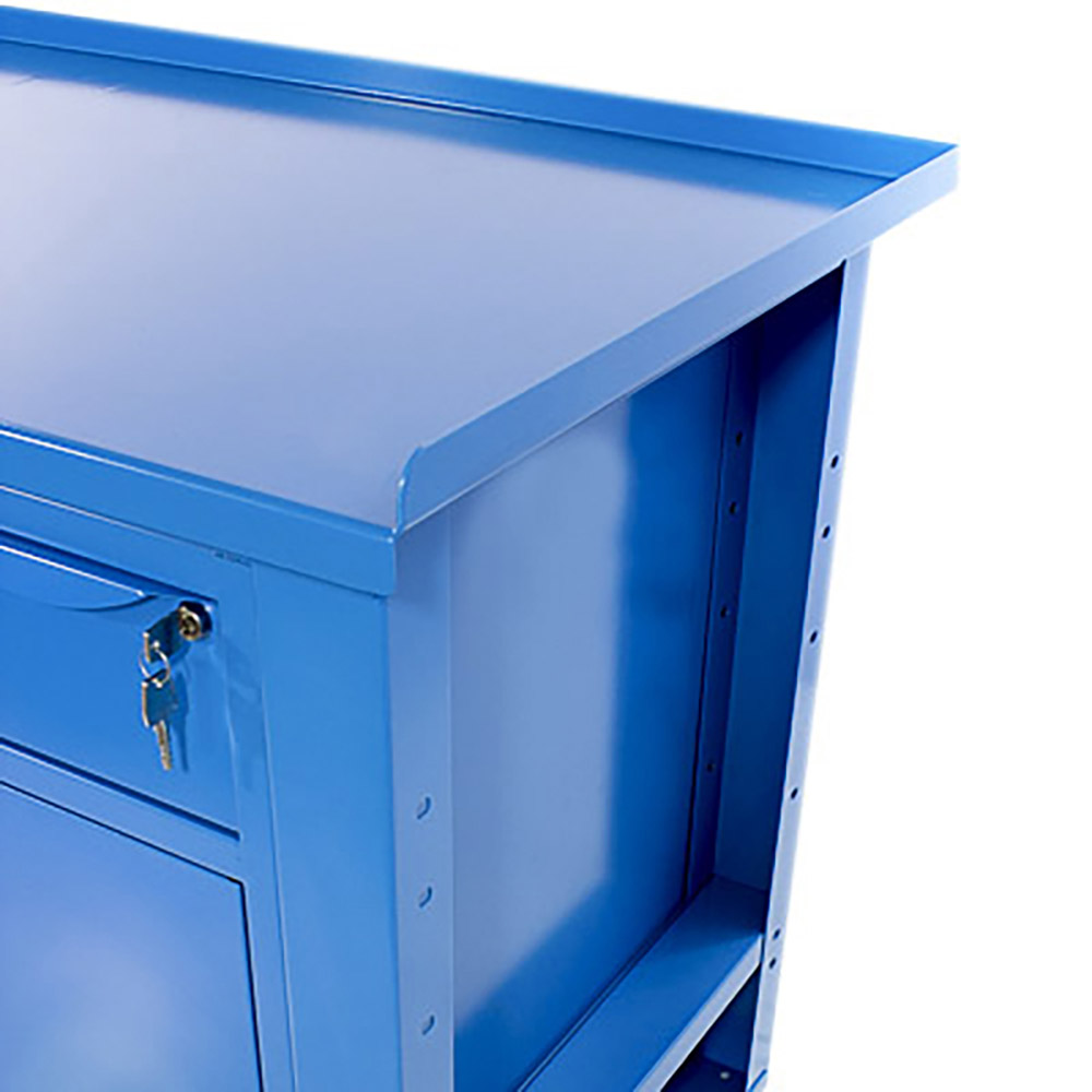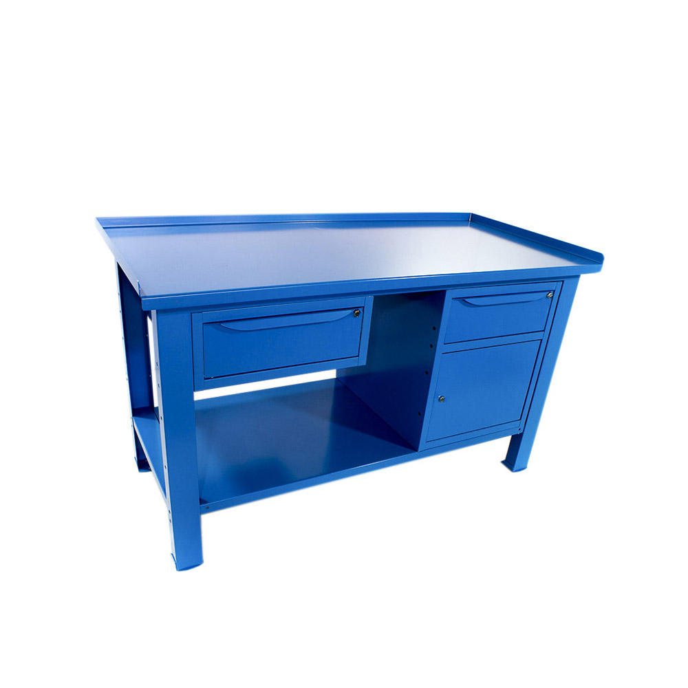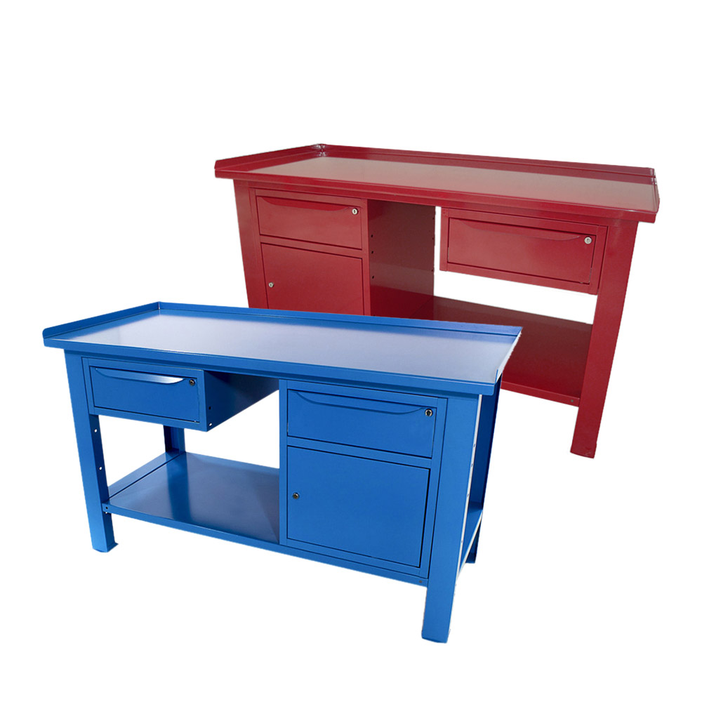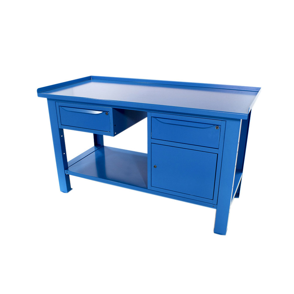 Banco da lavoro SOGI 1,5 m piano in acciaio + armadio con anta e cassetto + 1 cassetto - blu/rosso