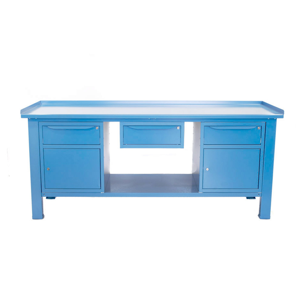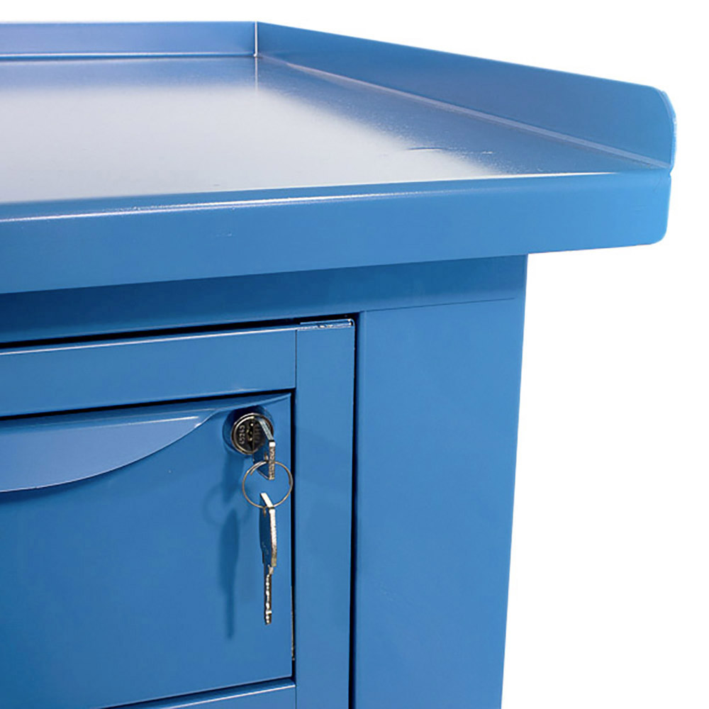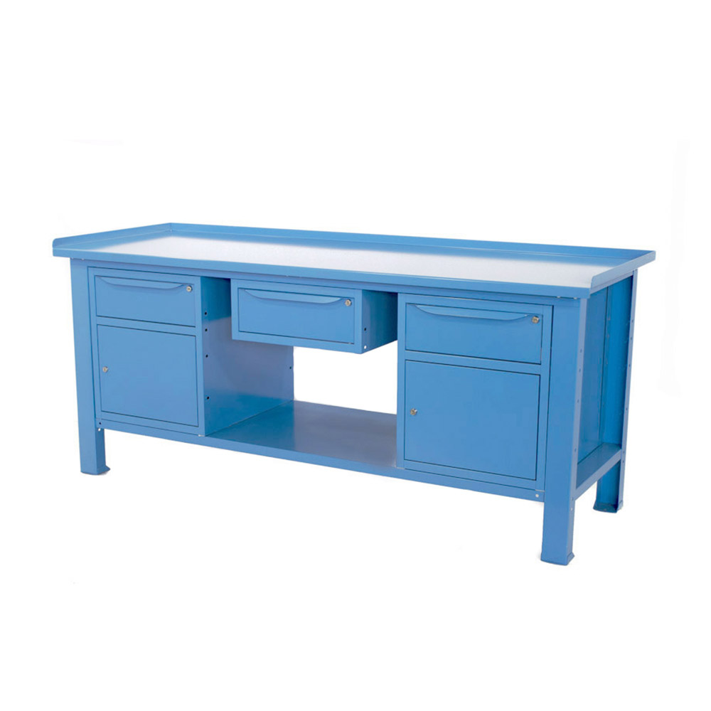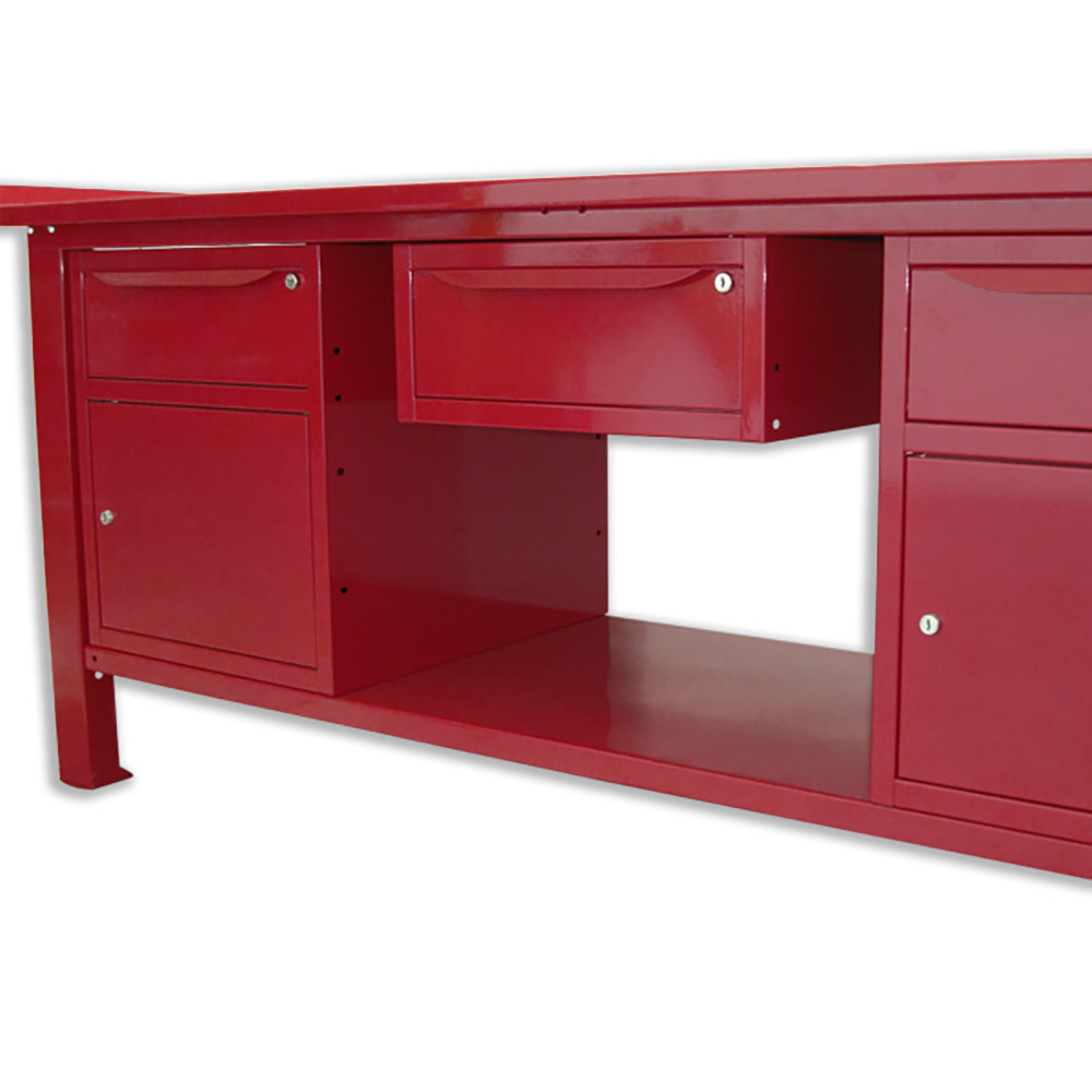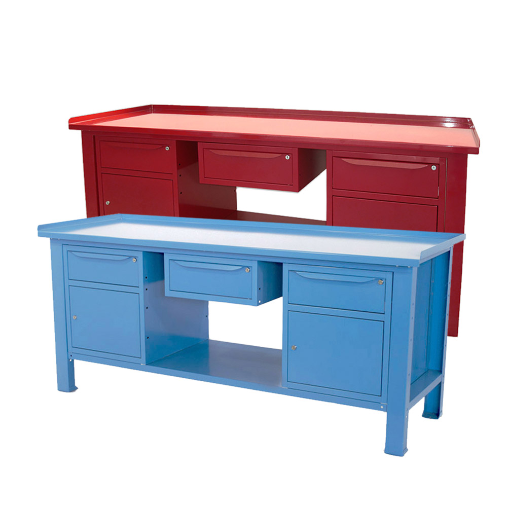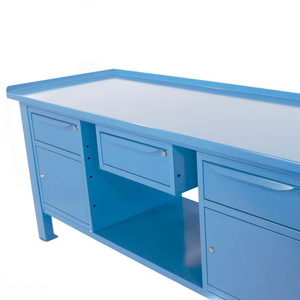 Banco lavoro SOGI 2m con piano in acciaio + 2 armadi con anta e cassetto + 1 casssetto - blu/rosso