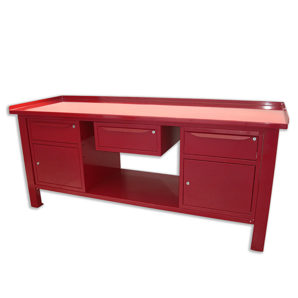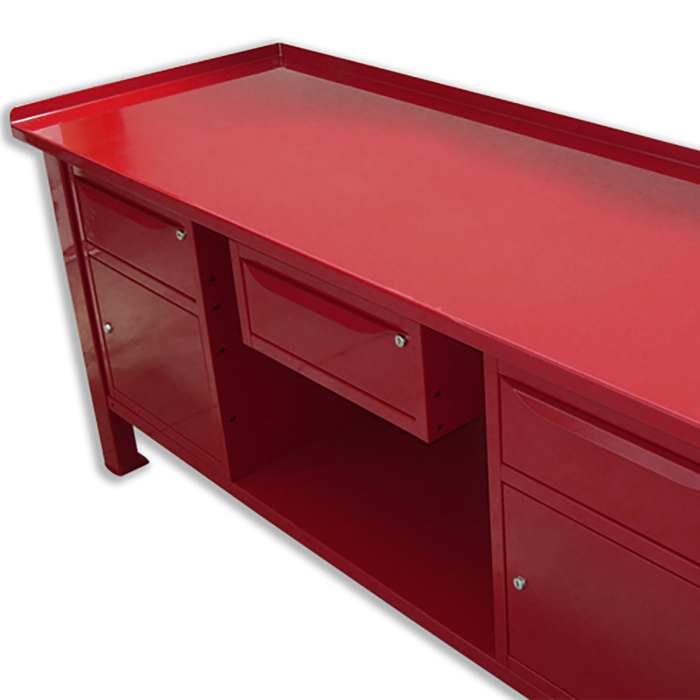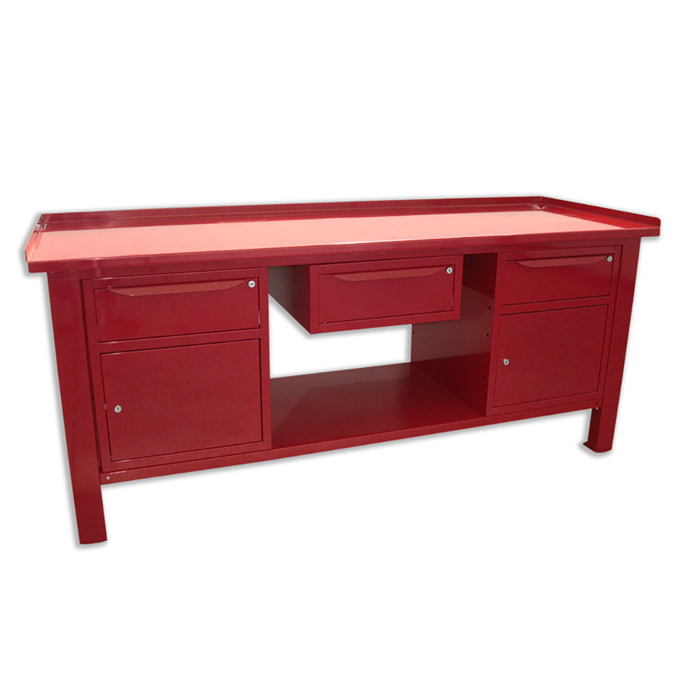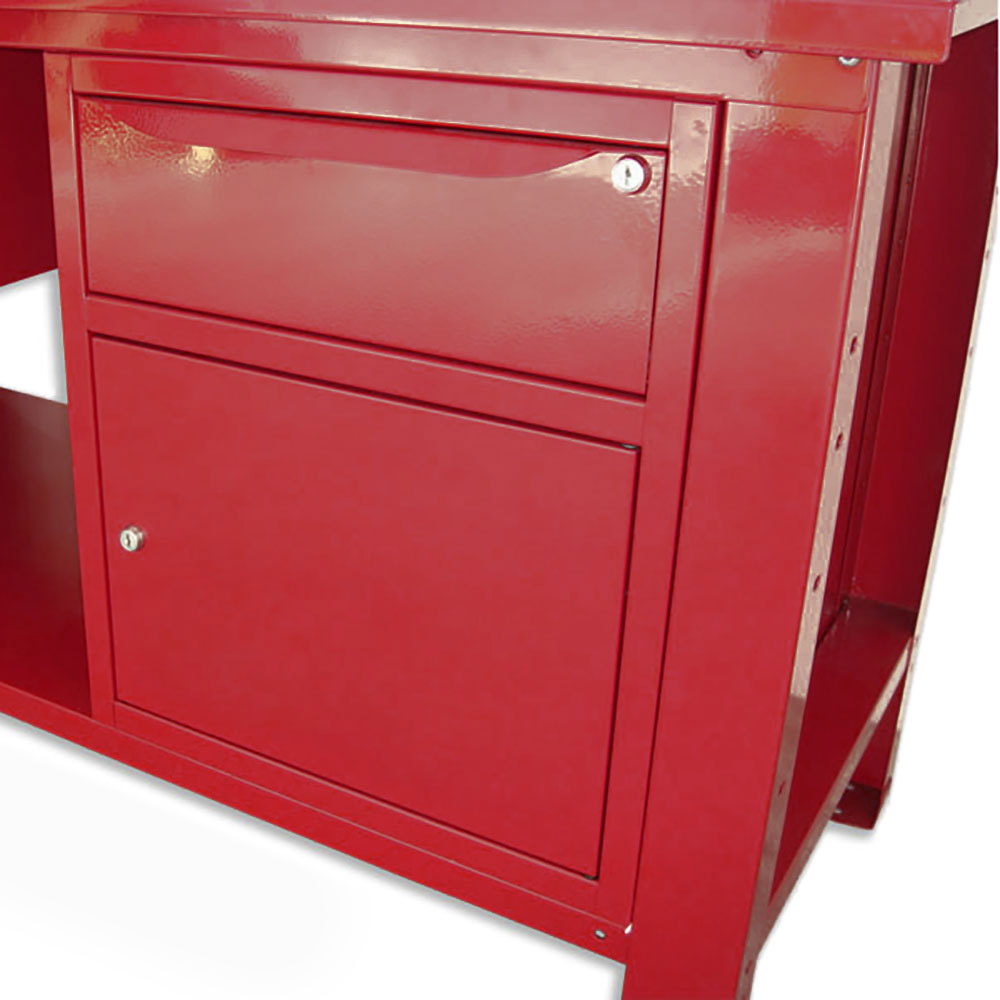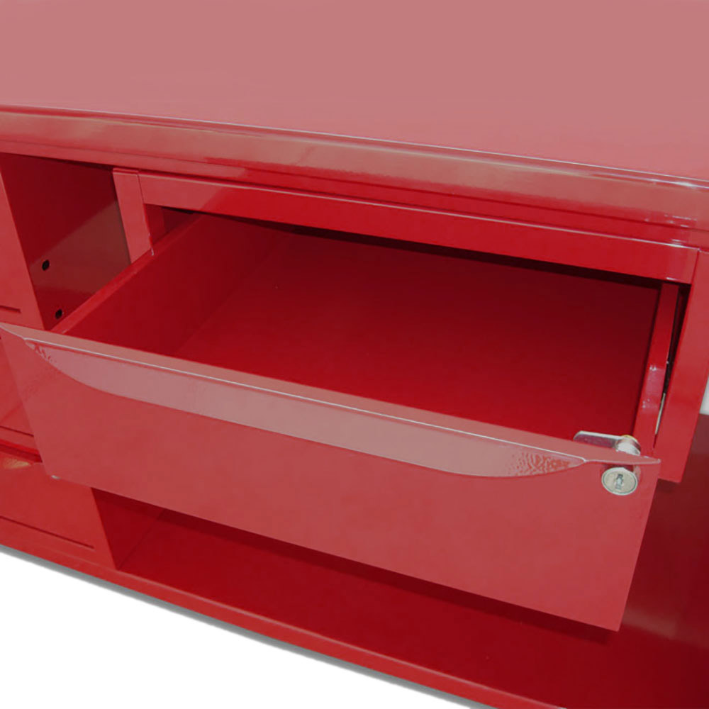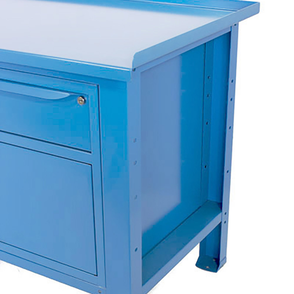 Banco lavoro SOGI 2m con piano in acciaio + 2 armadi con anta e cassetto + 1 casssetto - blu/rosso