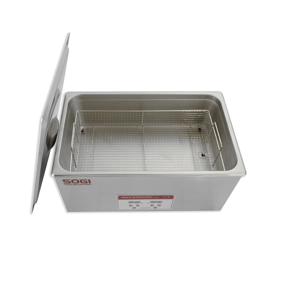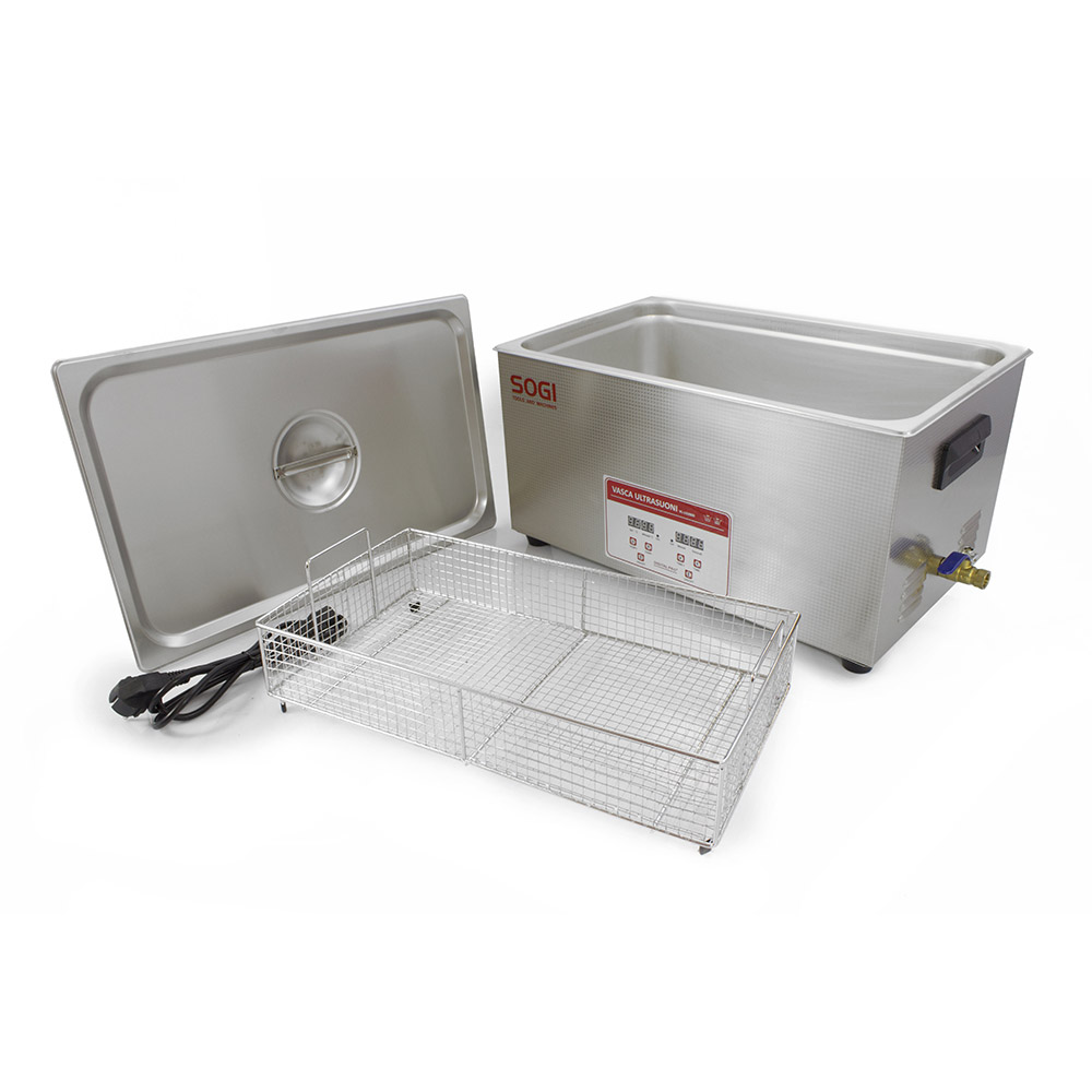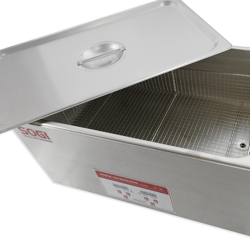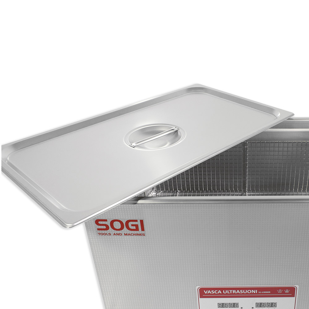 La vasca di lavaggio a ultrasuoni SOGI VL-U3000R è realizzata interamente in acciaio inox per contrastare la corrosione dei solventi o liquidi sgrassanti utilizzati durante il lavaggio dei pezzi. É inoltre dotata di riscaldamento con un massimo di 80° Celsius. Predisposta di ventola di raffreddamneto per il sistema di alimentazione.Il materiale con cui è realizzata la capacità di contenimento della vasca in esame è certificato AISI304, per cui l'articolo è idoneo al lavaggio di componenti ad uso alimentare o che vanno a contatto con il cibo. Viene utilizzata per la pulizia di componenti meccanici, testate, valvole, iniettori, supporti, schede elettroniche, componenti elettronici, cuscinetti, utensili. Di facile utilizzo grazie al pannello di comandi intuitivo LCD e tasti con potenziometro per regolarne la potenza degli attuatori ad ultrasuoni.La lavatrice non è solo stabile, ma anche facile da pulire. Si tratta di un investimento di lunga durata, il pulitore rimane sempre igienico, dunque non è un pericolo per la salute dell'utente.A corredo della macchina, sarà fornita tutta la documentazione necessaria (manuale d'installazione, uso e manutenzione e dichiarazione CE).Caratteristiche tecniche della Vasca di lavaggio a ultrasuoni SOGI VL-U3000RTimer da 0" a 30" minutiCapacità nominale: 30 lCapacità utile di lavoro: 28 lTrasduttore ultrasonico con 600 W e 40 kHzPotenza di riscaldamento: 500 WTemperatura massima fino a 80 °CDisplay LCDTasti di comando integratiMateriale contenimento vasca: acciaio AISI304Dimensioni utili interne (vasca): 500 x 300 x 200 H mmDimensioni utili cestello: 450 x 250 x 125 H mmDimensioni di ingombro: 530 x 325 x 325 H mmPeso totale: 15 kgGaranzia: 24 mesiIn dotazioneManuale d'installazione, uso e manutenzione e dichiarazione CECestello di setaccio