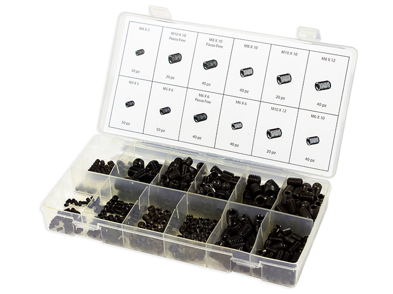 GRANI CON PUNTA PIATTA IN ACCIAIO MASCHIO DA M3 A M10 SUDDIVISI PER TIPO E DIMENSIONE ALL'INTERNO DI APPOSITA SCATOLA CON SCOMPARTI