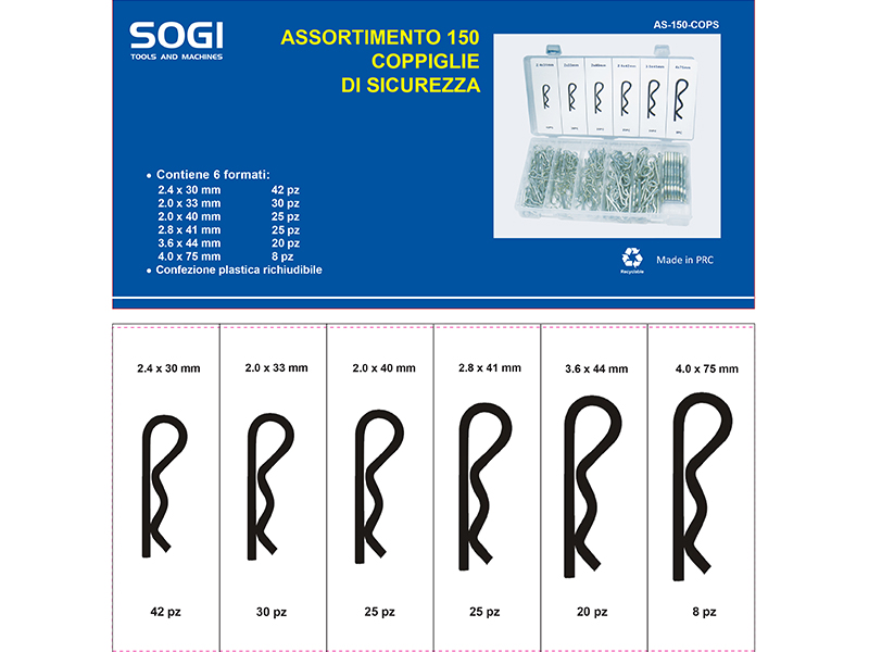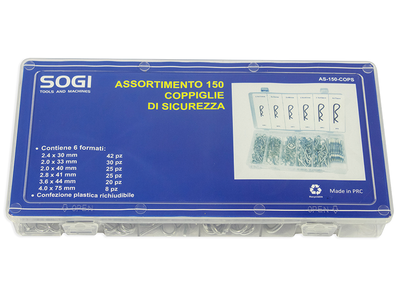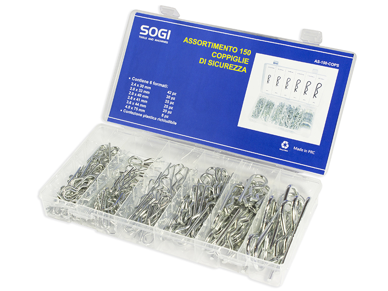 ASSORTIMENTO SET SERIE DI 150 COPPIGLIE DI SICUREZZA PERNI FERMI SOGI AS-150-COP ACCIAIO