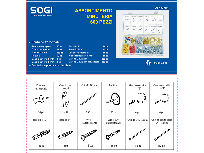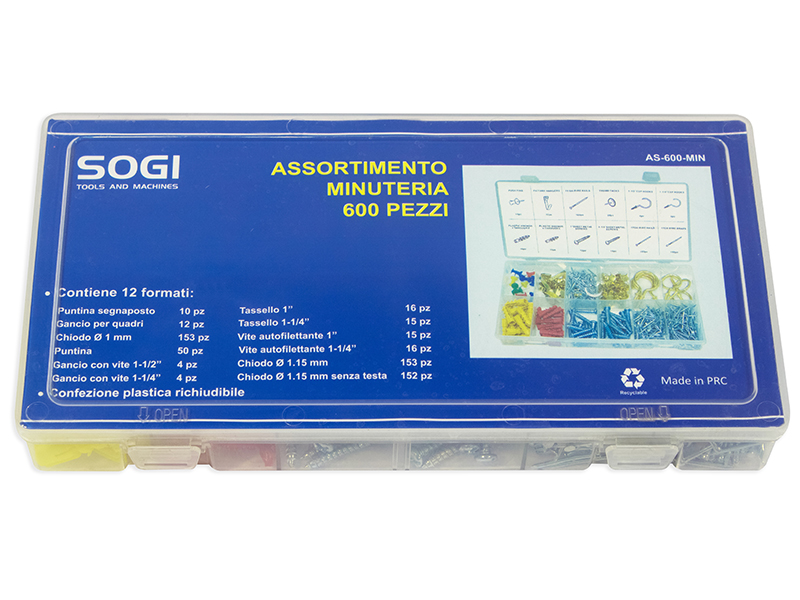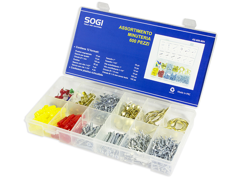ASSORTIMENTO SET SERIE DI 600 GANCI CHIODI VITI TASSELLI MURO PER CASA SOGI AS-600-MIN