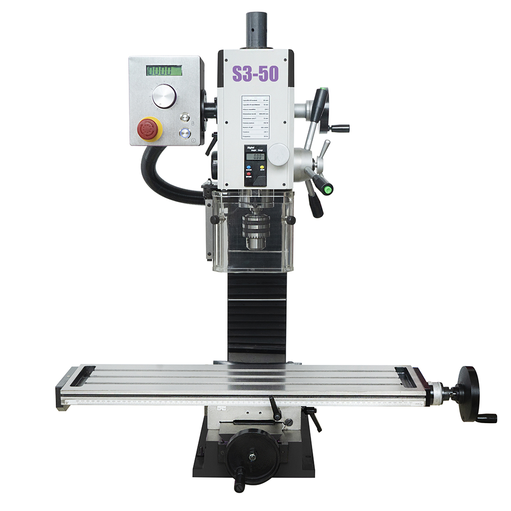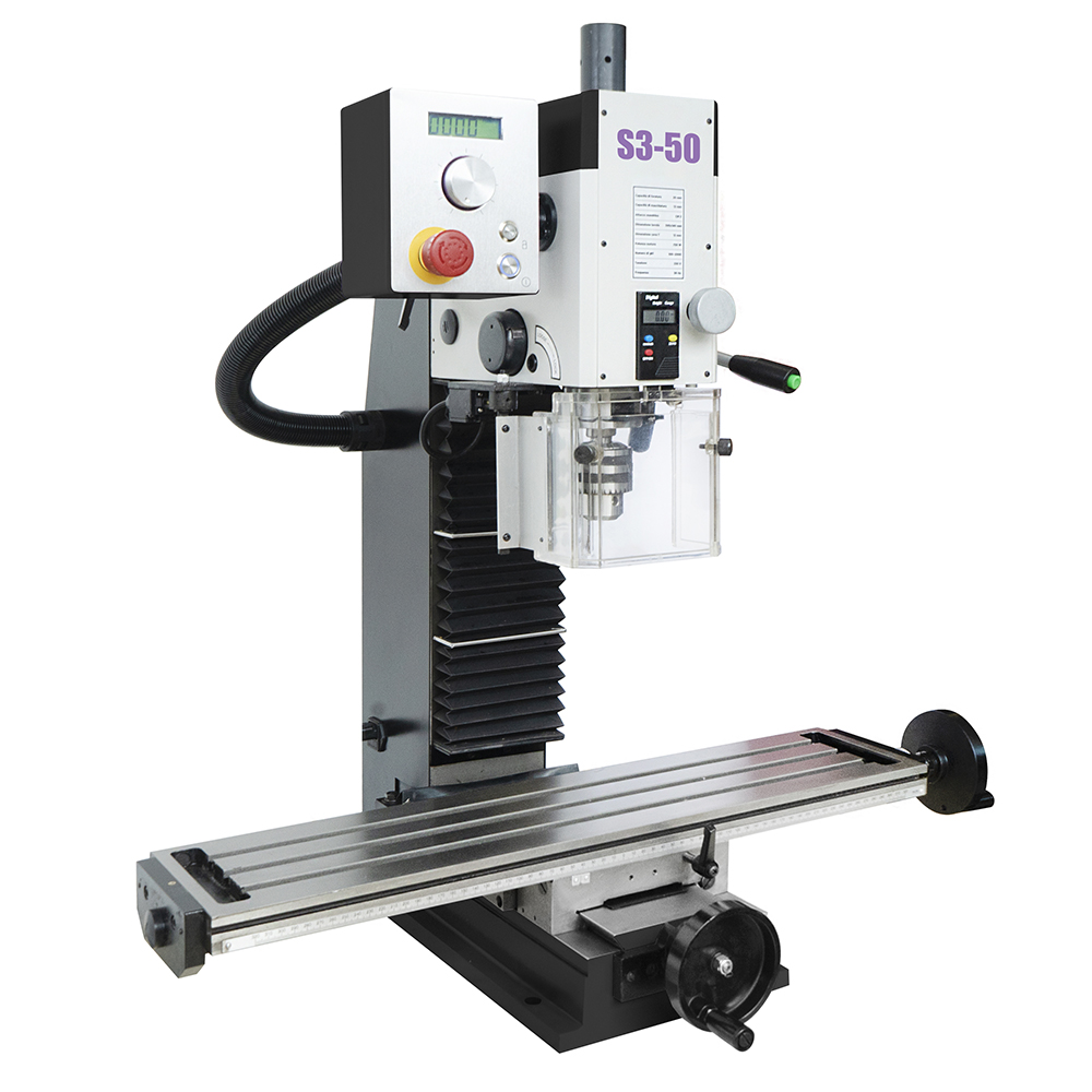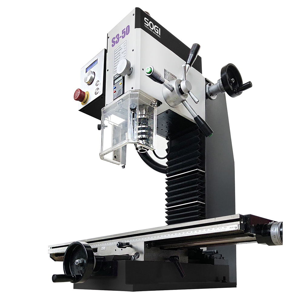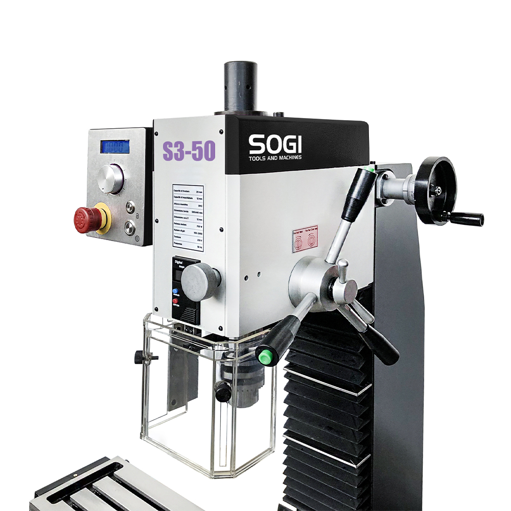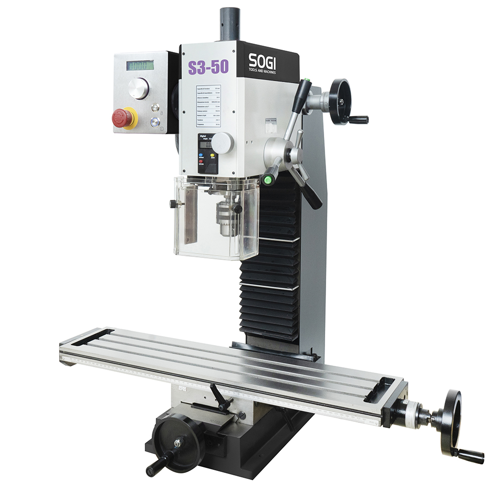 La fresatrice da banco SOGI S3-50 è una macchina utensile funzionale e compatta, in grado di eseguire forature, alesature, filettature, maschiature e fresature (con l'ausilio di utensili a candela, ad inserti o a disco) su materiali quali ghisa e acciaio. Grazie alle dimensioni generose della tavola portapezzo ed alla facilità d'utilizzo, il trapano-fresa SOGI S3-50 si adatta particolarmente bene sia ad un uso professionale che hobbistico.
