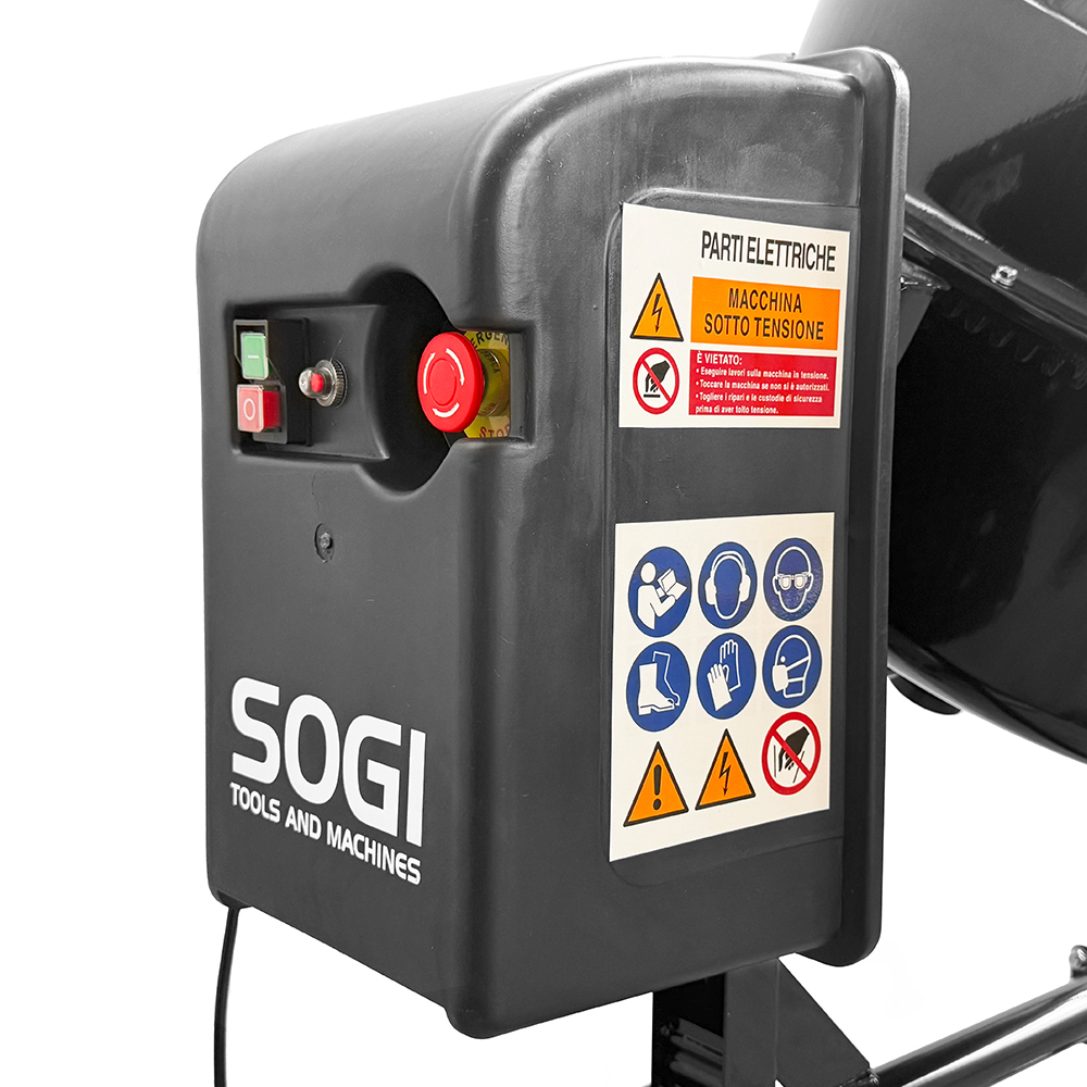 La betoniera elettrica SOGI BEM-200 ha un sistema di trasmissione del moto che avviene tramite un pignone in solida ghisa che ingrana sulla corona dentata presente sulla superficie esterna del bicchiere. La vasca di mescolazione è munita di un pratico sistema di ribaltamento con bloccaggio in 16 posizioni e di un volante che comanda il movimento del bicchiere: un pedale di sicurezza comanda lo sblocco del volante per lo scarico del materiale lavorato. Sul carter del motore è locato un interruttore (fungo) di emergenza per interrompere nell’immediato il funzionamento della macchina in situazioni critiche.