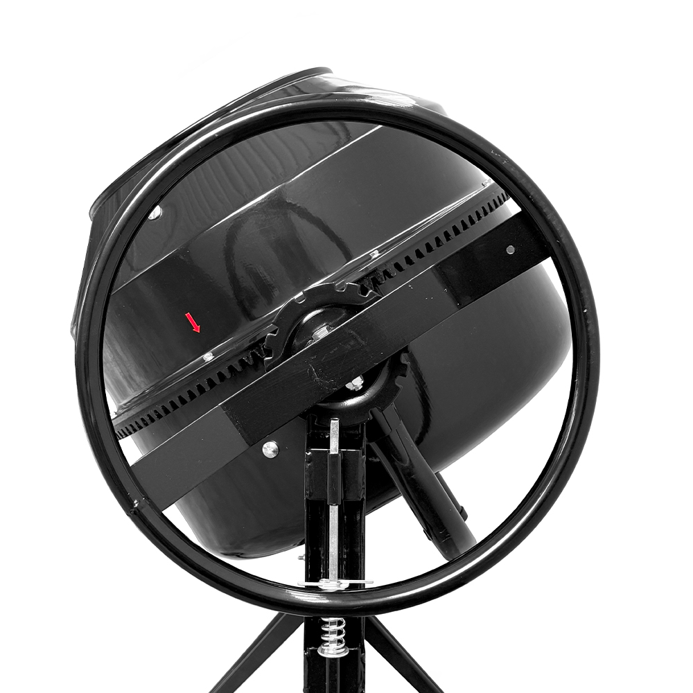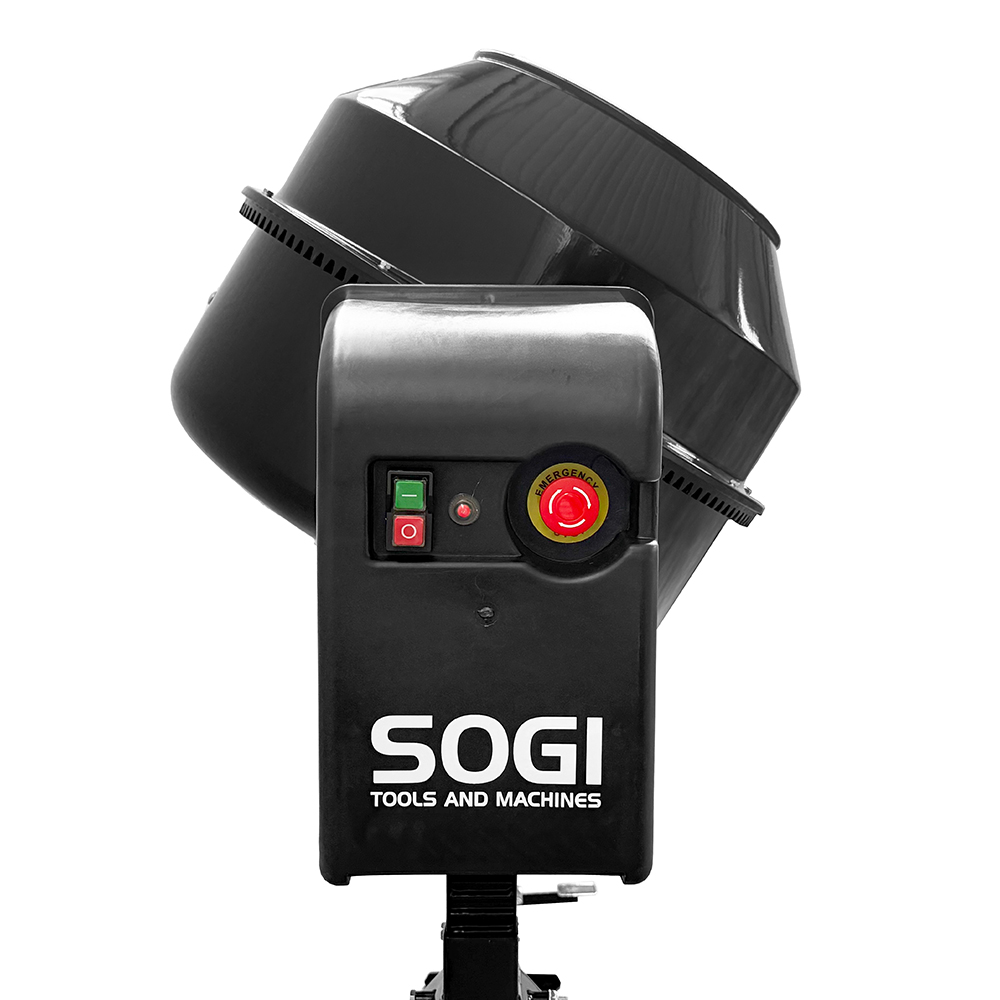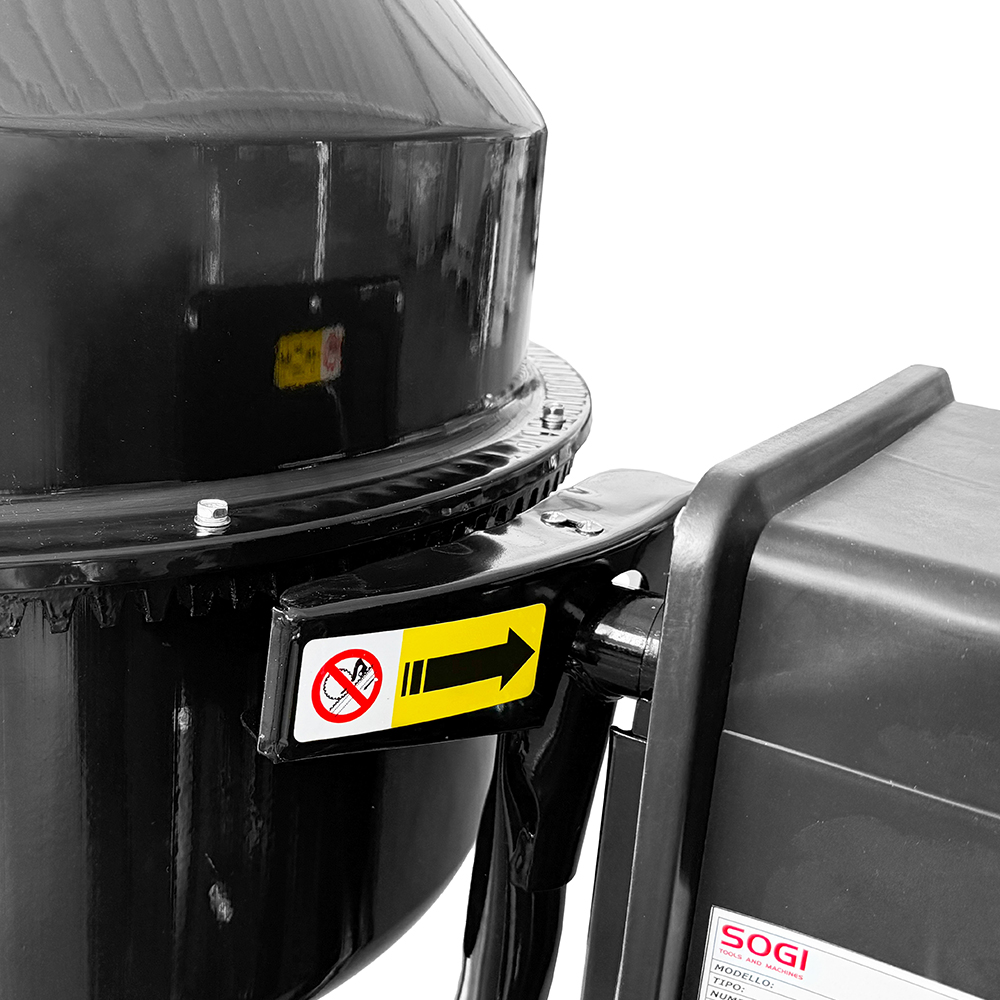 La betoniera elettrica SOGI BEM-140 ha un sistema di trasmissione del moto che avviene tramite un pignone in solida ghisa che ingrana sulla corona dentata presente sulla superficie esterna del bicchiere. La vasca di mescolazione è munita di un pratico sistema di ribaltamento con bloccaggio in 16 posizioni e di un volante che comanda il movimento del bicchiere: un pedale di sicurezza comanda lo sblocco del volante per lo scarico del materiale lavorato. Sul carter del motore è locato un interruttore (fungo) di emergenza per interrompere nell’immediato il funzionamento della macchina in situazioni critiche.