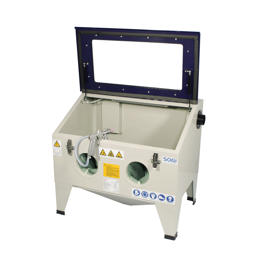 La sabbiatrice da banco SOGI S-72 è in grado di sabbiare, pulire e satinare le superfici metalliche, tramite un flusso in pressione di particelle abrasive secche, come microsfere di vetro o corindone. Nella lavorazione può presentare diversi gradi di finitura, variando la granulometria delle particelle abrasive e del tipo di particolari da lavorare, come pezzi in legno, motori, pezzi meccanici e altri metalli, plastiche etc.