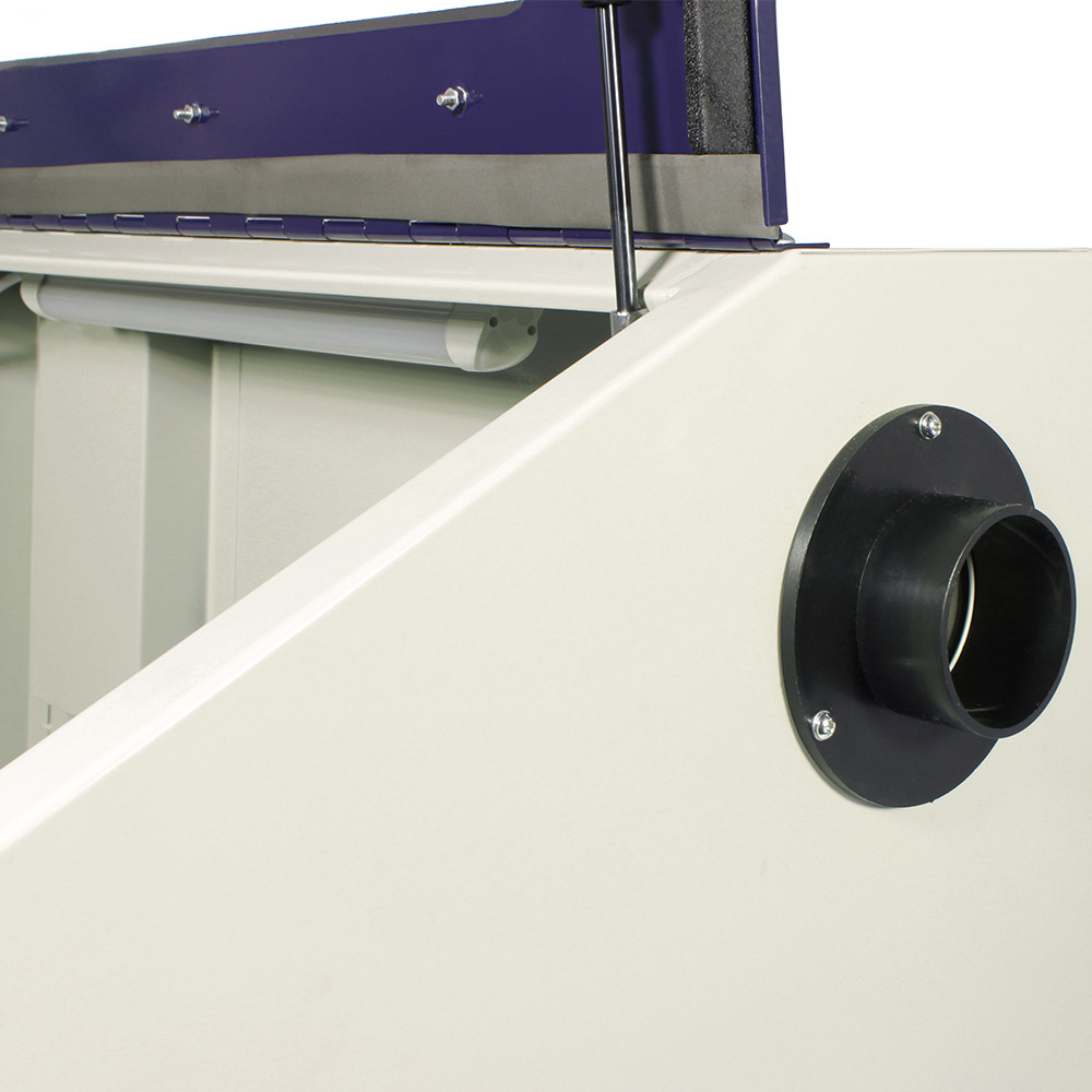 Comodo e pratico pannello frontale in vetro per la verifica del proprio operato attraverso lo schermo posto sopra la macchina con impianto di illuminazione. Per introdurre il pezzo da lavorare in questo modello basta sollevare la parte superiore attuata da due ammortizzatori a gas. Dotata di filtro aspirazione con predisposizione per aspiratore.