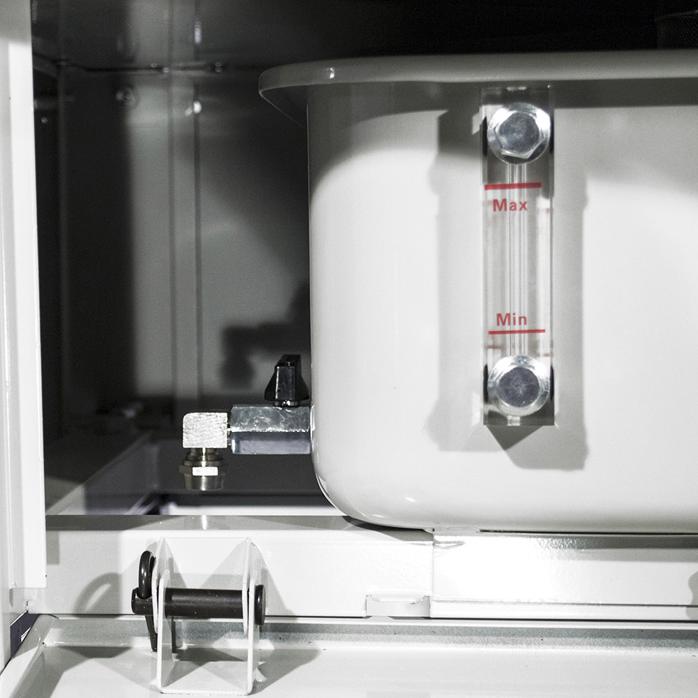 Il piano interno di lavoro, è corredato da apposito grigliato di sgocciolamento del pezzo e relativo recupero del liquido di lavaggio. Cabina di Lavaggio realizzata in acciaio e verniciata a polvere epossidica per resistere a lungo nel tempo, dotata di riscaldamento e pressione regolabili mediante comodo pannello frontale di comando.