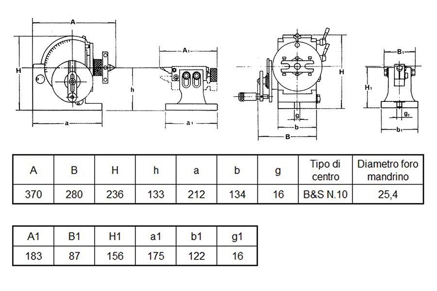 Le divisioni possono essere ottenute per via diretta, indiretta o differenziale: un disco graduato con 24 tacche incise consente l'esecuzione di 2, 3, 4, 6, 8, 12 e 24 divisioni dirette, mentre un sistema vite senza fine-ruota elicoidale (rapporto di trasmissione 1/40) esegue indirettamente fino a 50 divisioni. La testa può essere ruotata fino a 90°, mentre la tavola girevole può compiere rotazioni complete (360°).