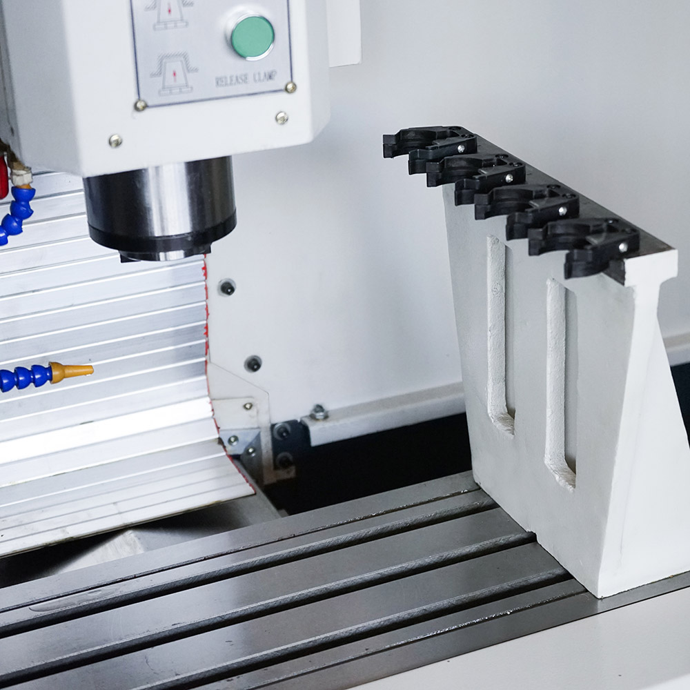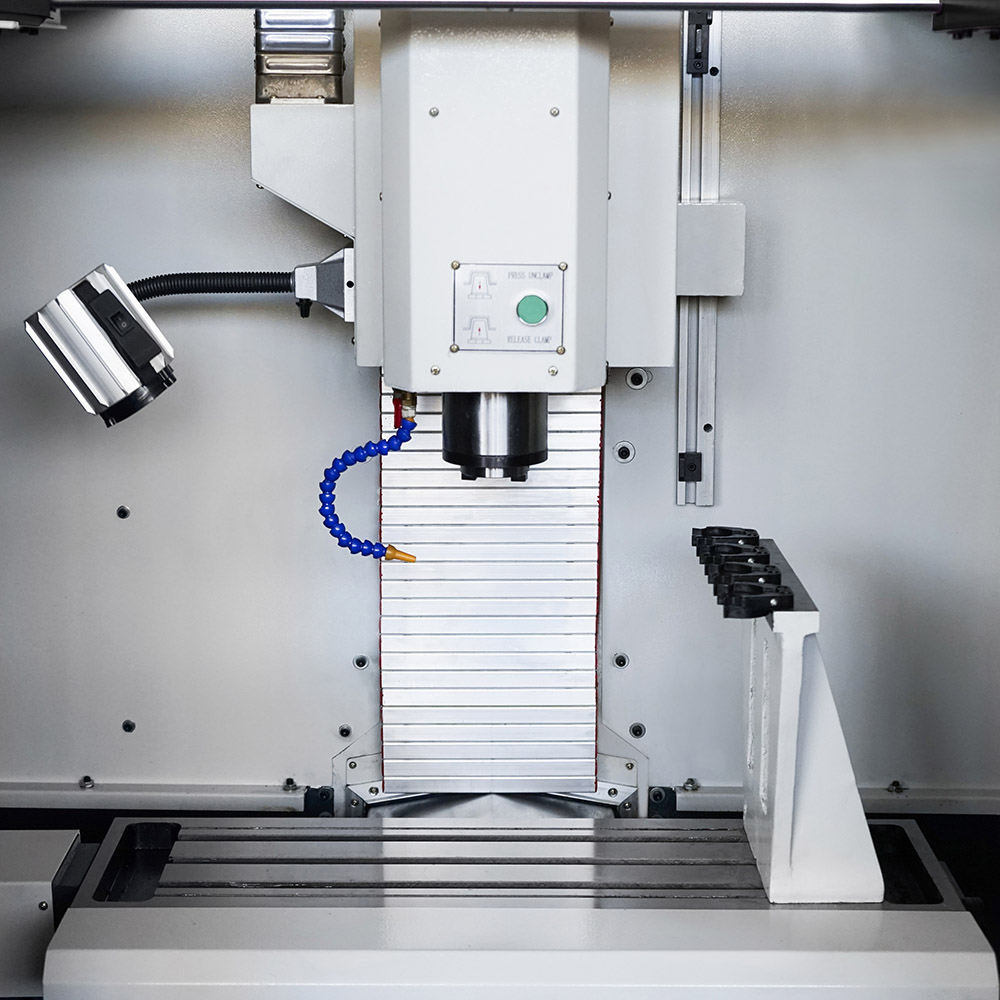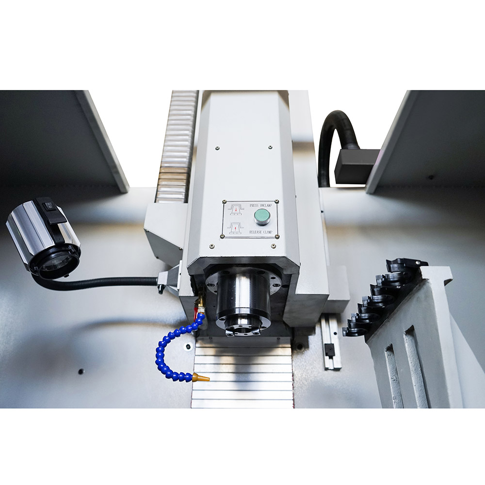 Il mandrino, di fattura Taiwanese e montato su cuscinetti conici di elevata precisione, è azionato da un motore trifase da ben 3.7 kW che consente regimi di rotazione fino a 6000 giri/min con regolazione in continuo della velocità. Il magazzino del tipo pick-up ha 4 possibili postazioni per lo stoccaggio degli utensili necessari ad ultimare la lavorazione.