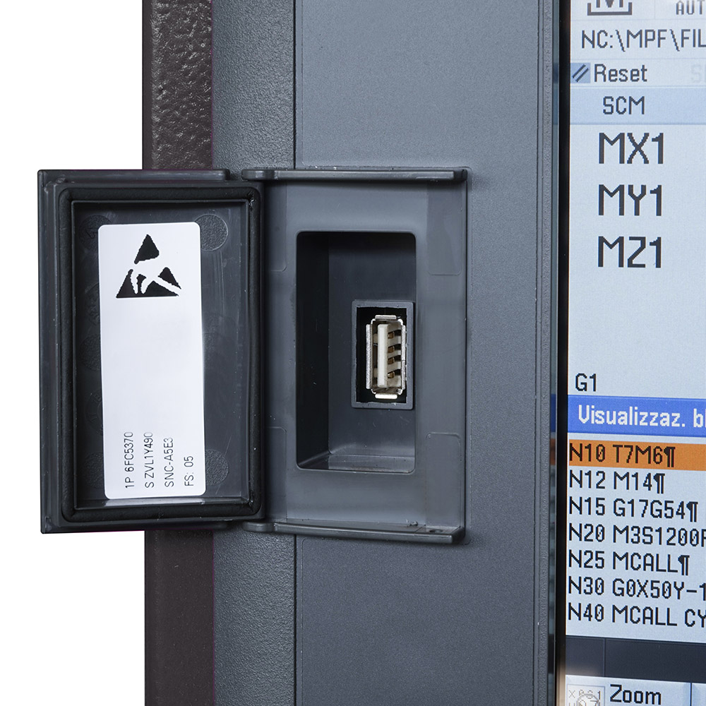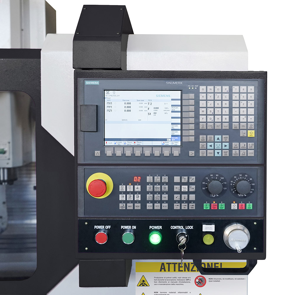 La fresatrice a controllo numerico SOGI S4-80C vanta di serie un pannello di comando con le moderne funzionalità del SIEMENS SINUMERIK 808D ADVANCED. Il pannello operatore è realizzato in pressofusione di magnesio ad alta resistenza e comprende: un display a colori da 8,4”, una tastiera CNC completa QWERTY e due interfacce, una USB, l’altra Ethernet sul frontalino.
