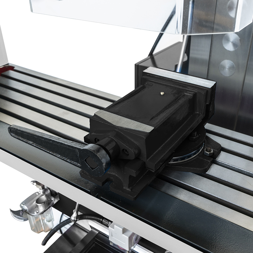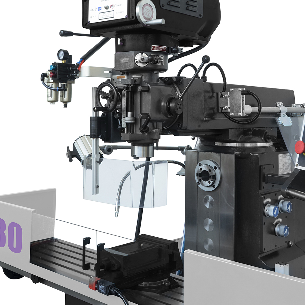 Nell'equipaggiamento di serie è incluso il visualizzatore di quote in grado di mostrare la posizione dell'utensile in 3 assi (X, Y e Z) con precisioni fino a 0.5 µm. I due mandrini (orizzontali e verticali), così come la tavola portapezzo, sono provvisti di ripari in policarbonato interbloccati (micro-interruttori) nel rispetto degli standard vigenti in materia di sicurezza. La macchina è dotata di impianto di lubrorefrigerazione e lampada.