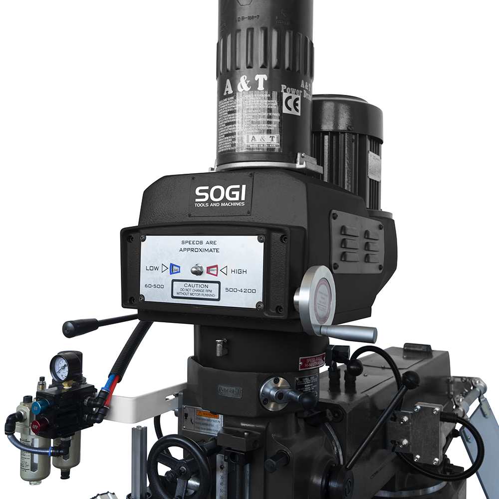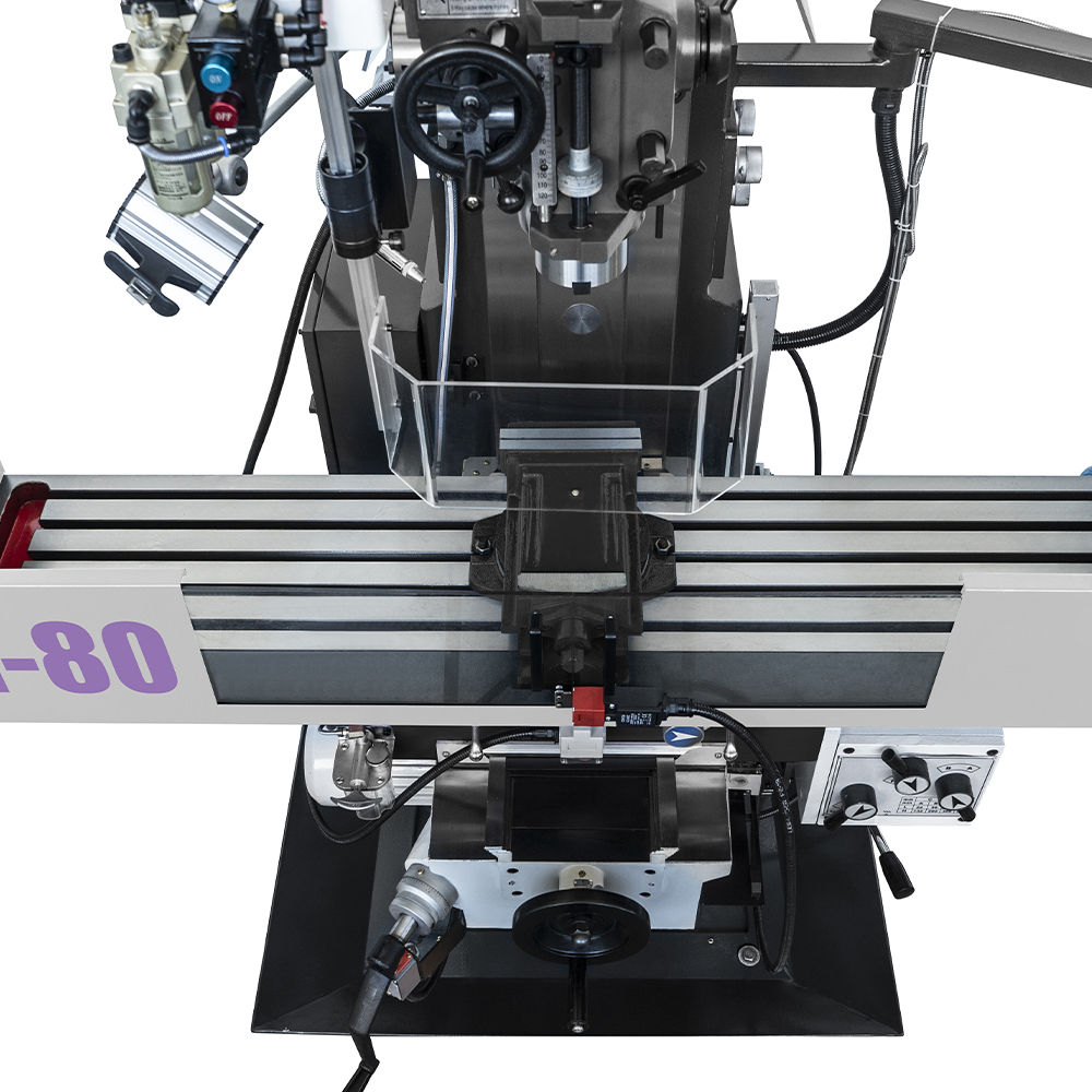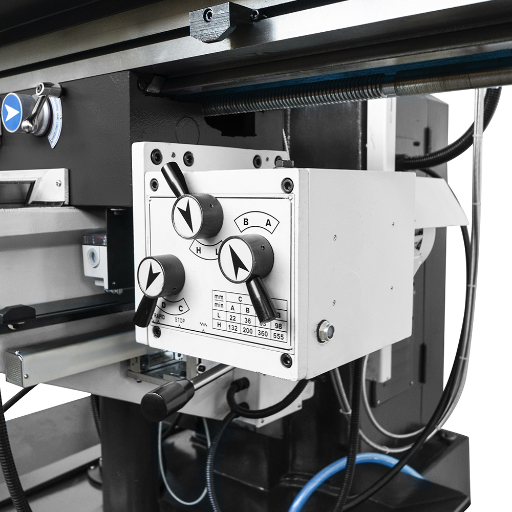 La fresatrice per metalli SOGI FR-80 è provvista di avanzamenti automatici della tavola longitudinali (asse X) e trasversali (asse Y), garantiti da apposito motoriduttore a ingranaggi in bagno d'olio con velocità settabili per mezzo di pratiche leve. L'avanzamento verticale (asse Z) della tavola è attuabile sia grazie ad un volantino apposito, sia per mezzo di un motore asincrono trifase compatto ed efficiente. Mediante un semplice sistema di leve e perni, si realizza la discesa automatica del cannotto con un'escursione di 125 mm.