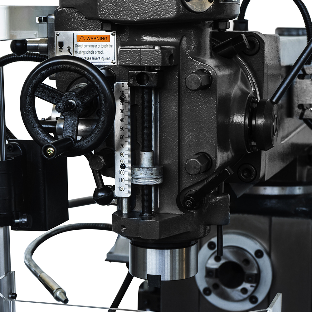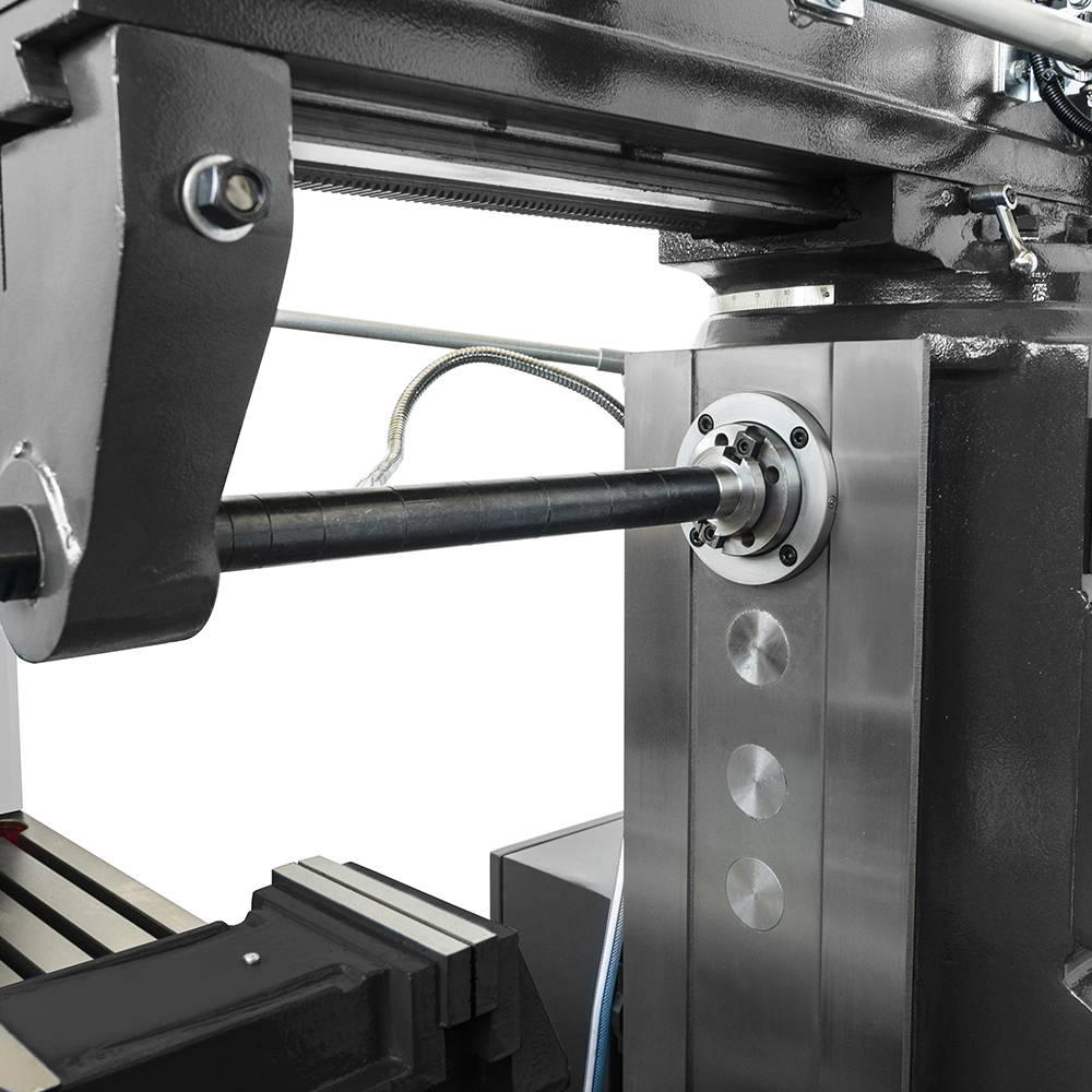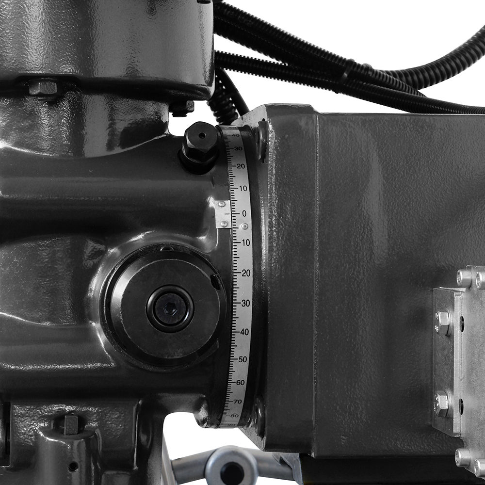 La testa della fresatrice è inclinabile di ± 90° rispetto all'asse trasversale; inoltre, a seconda delle necessità di lavorazione, la testa può essere ruotata di ± 180° rispetto l'asse verticale e traslata avanti e indietro lungo l'asse trasversale. L'attacco del mandrino verticale è di tipo ISO 40 con tirante pneumatico di serie. L'attacco del mandrino orizzontale è anch'esso di tipo ISO 40 con tirante di bloccaggio e supporto albero porta-frese per fresature con utensili a disco.